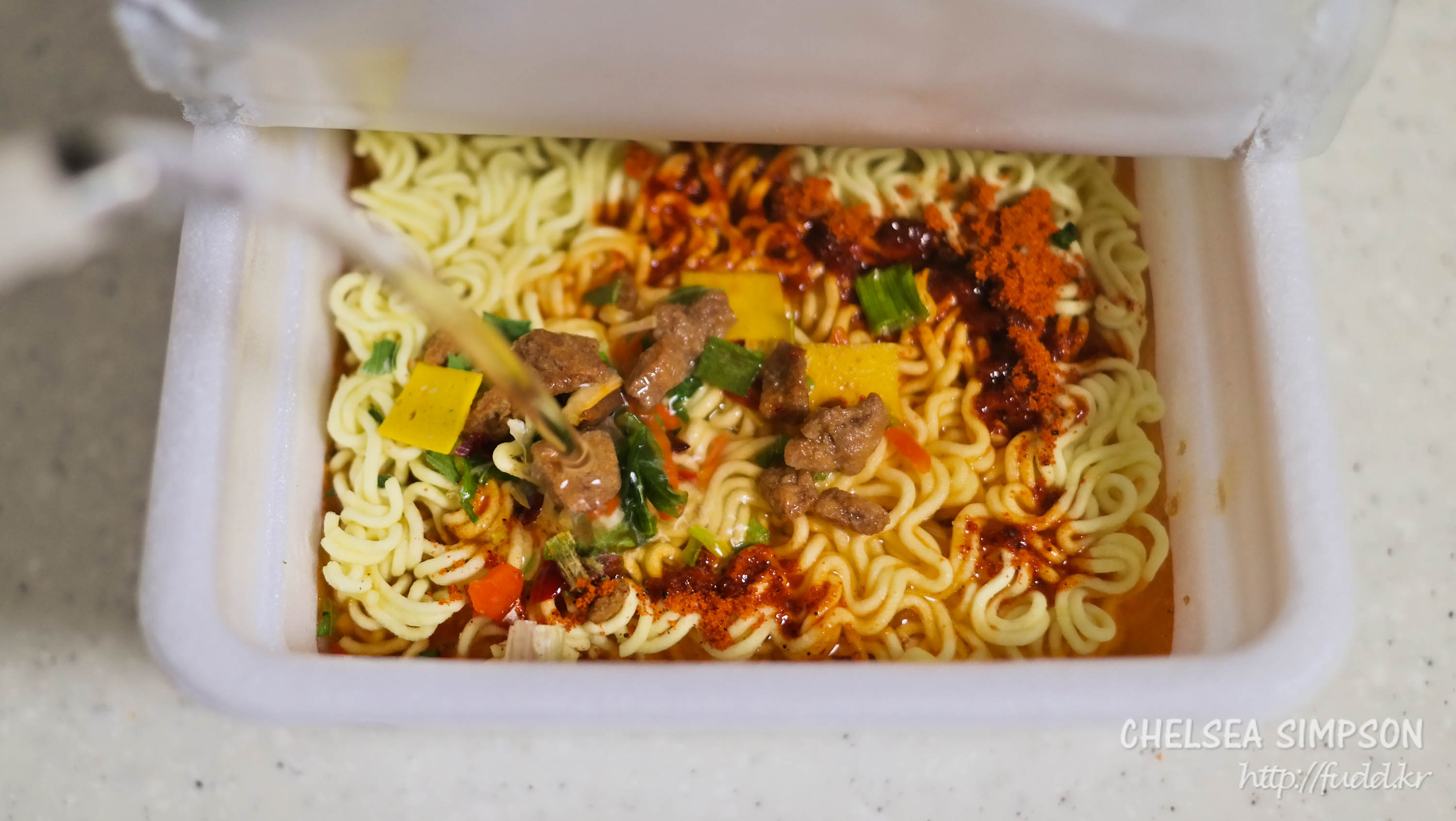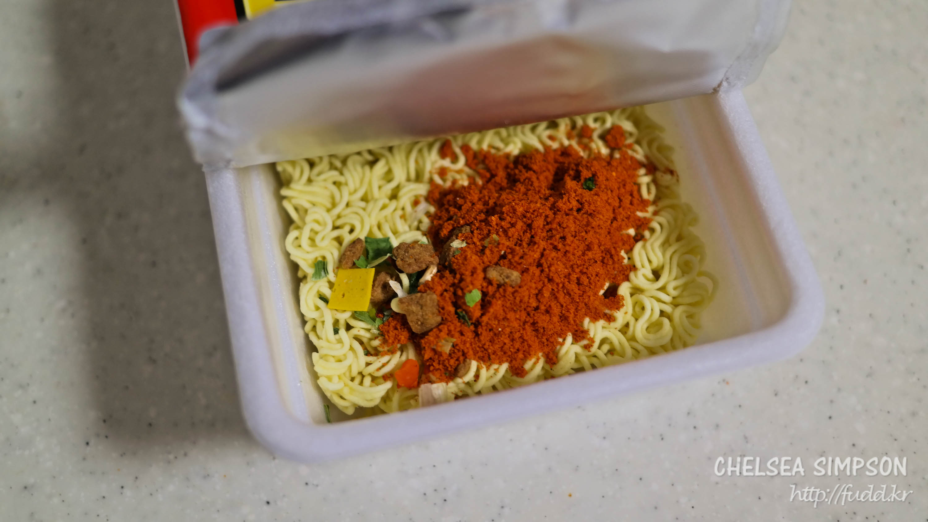 조리법은 끓는 물을 내부 표시선까지 붓고 3분 기다리는 것.