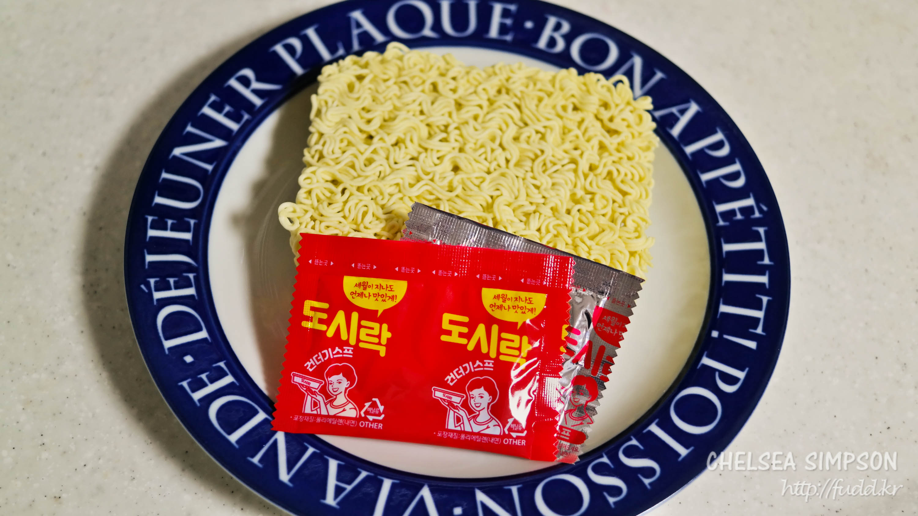 도시락 컵라면의 내용물은 네모난 면과 분말스프, 건더기스프.