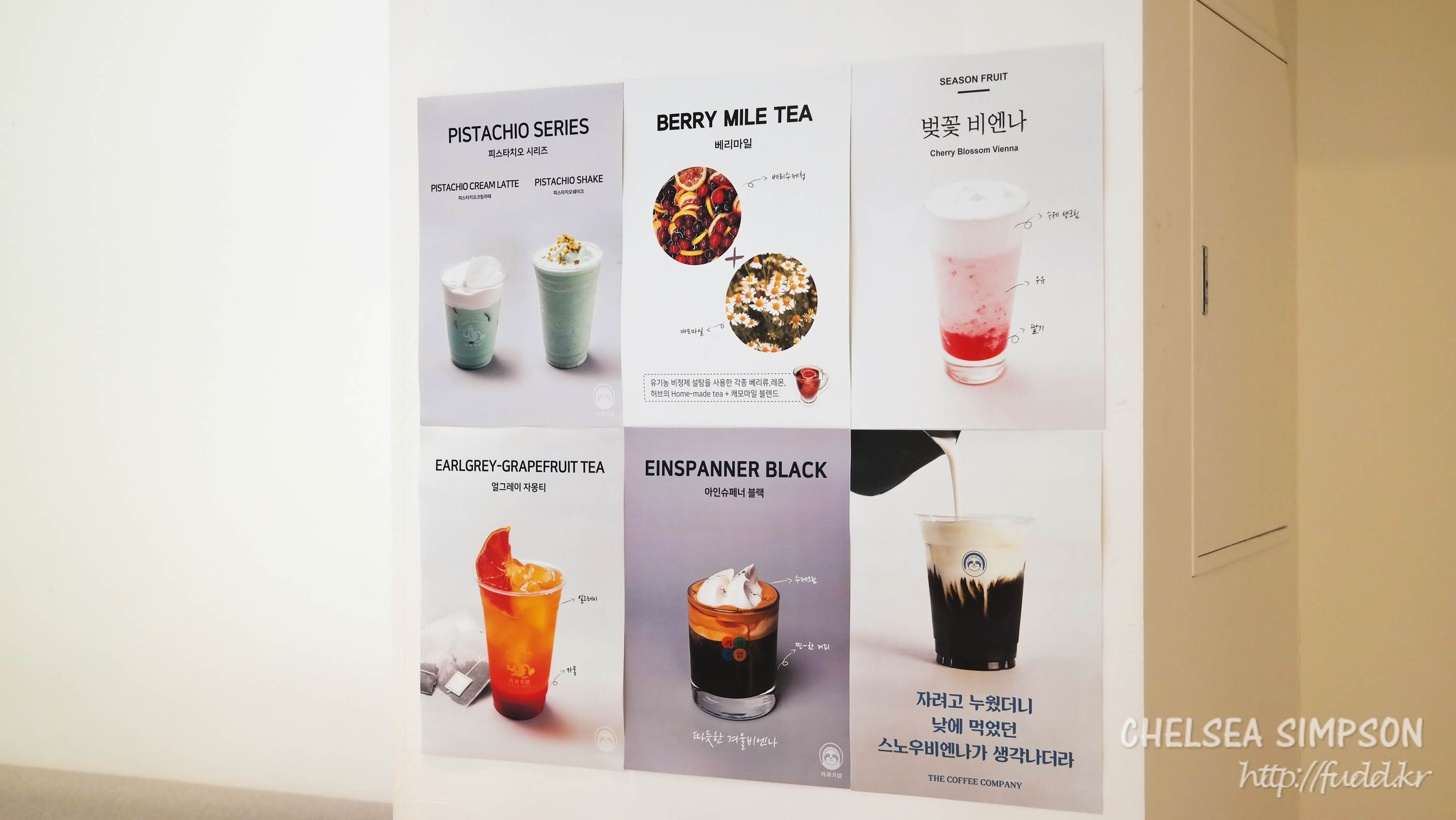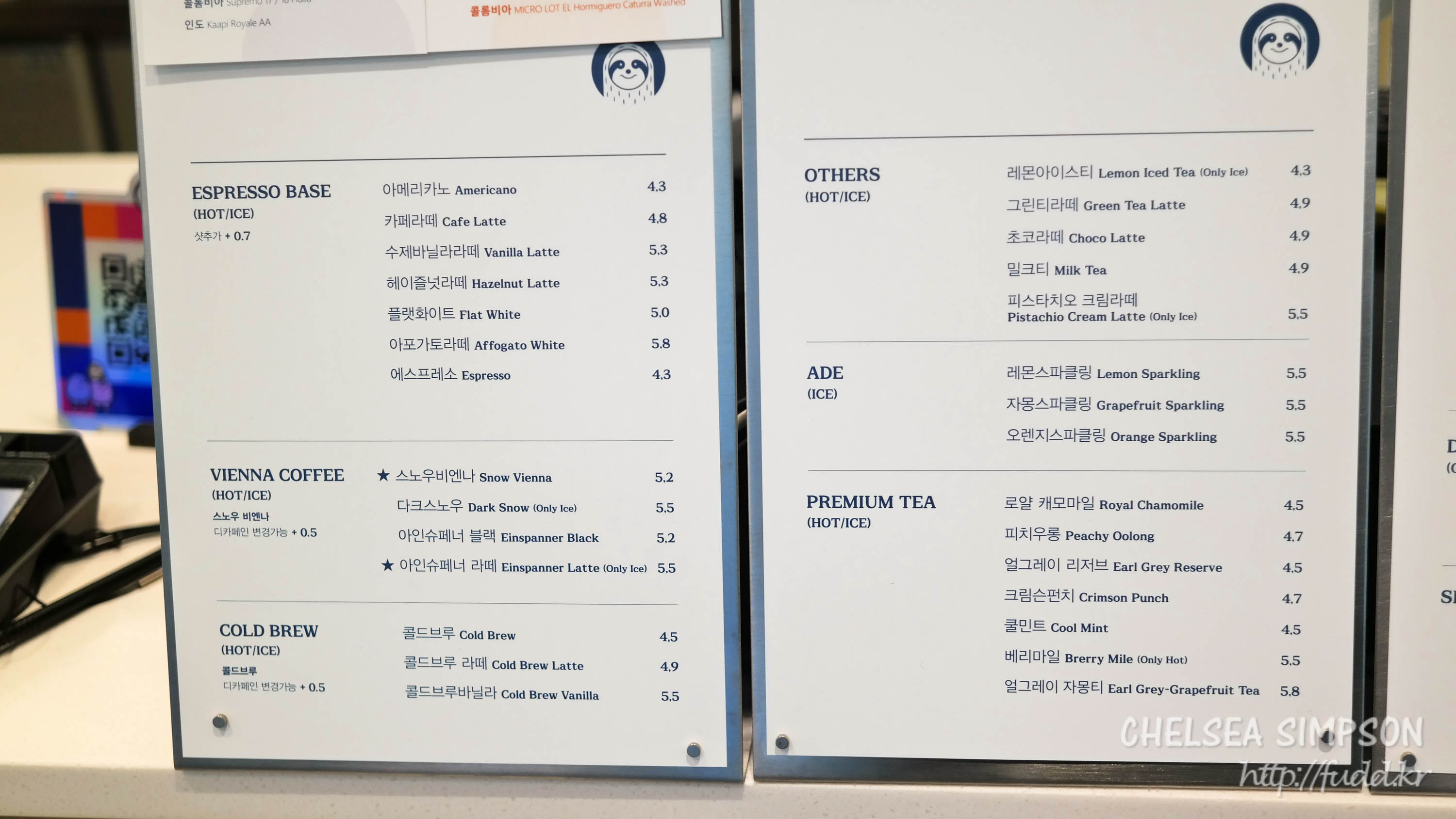 에스프레소 커피, 비엔나 커피, 콜드브루 커피, 에이드, 차 종류도 파는데 가격은 거의 오천원 내외.