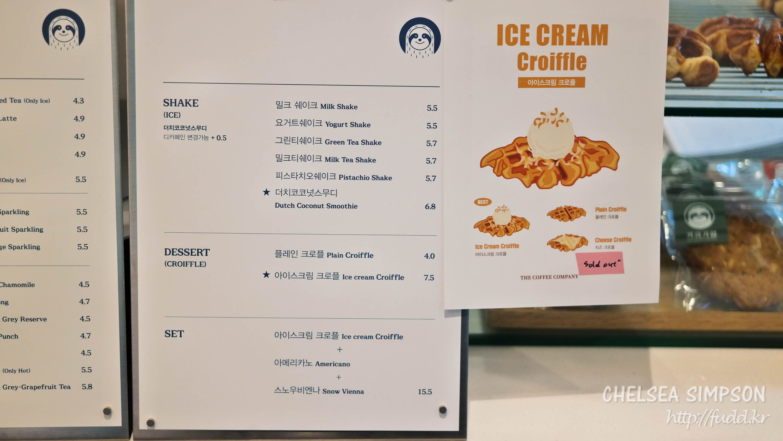 셰이크와 스무디 종류도 판매하고 크로플은 플레인과 아이스크림 올린 것이 있다.