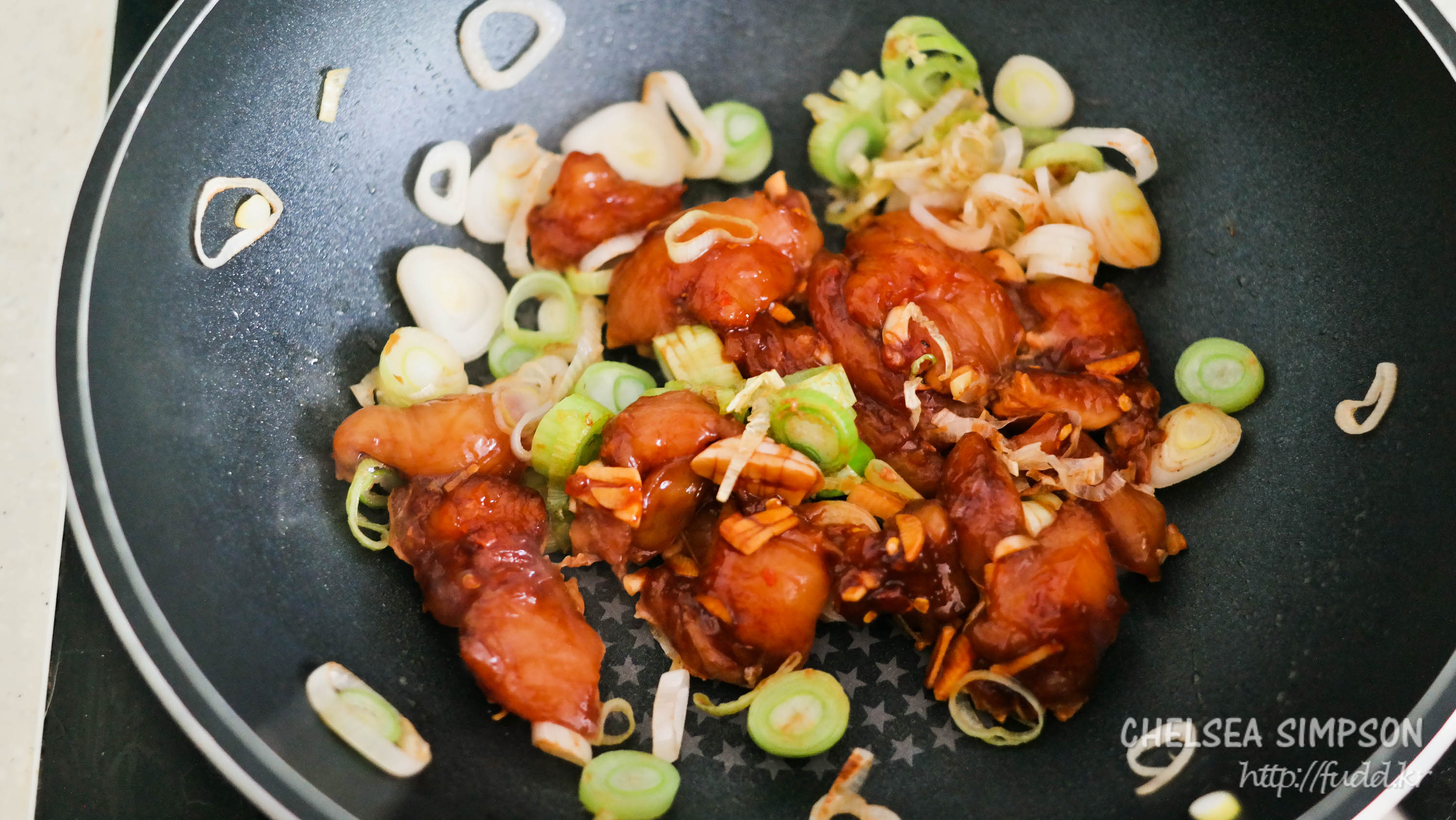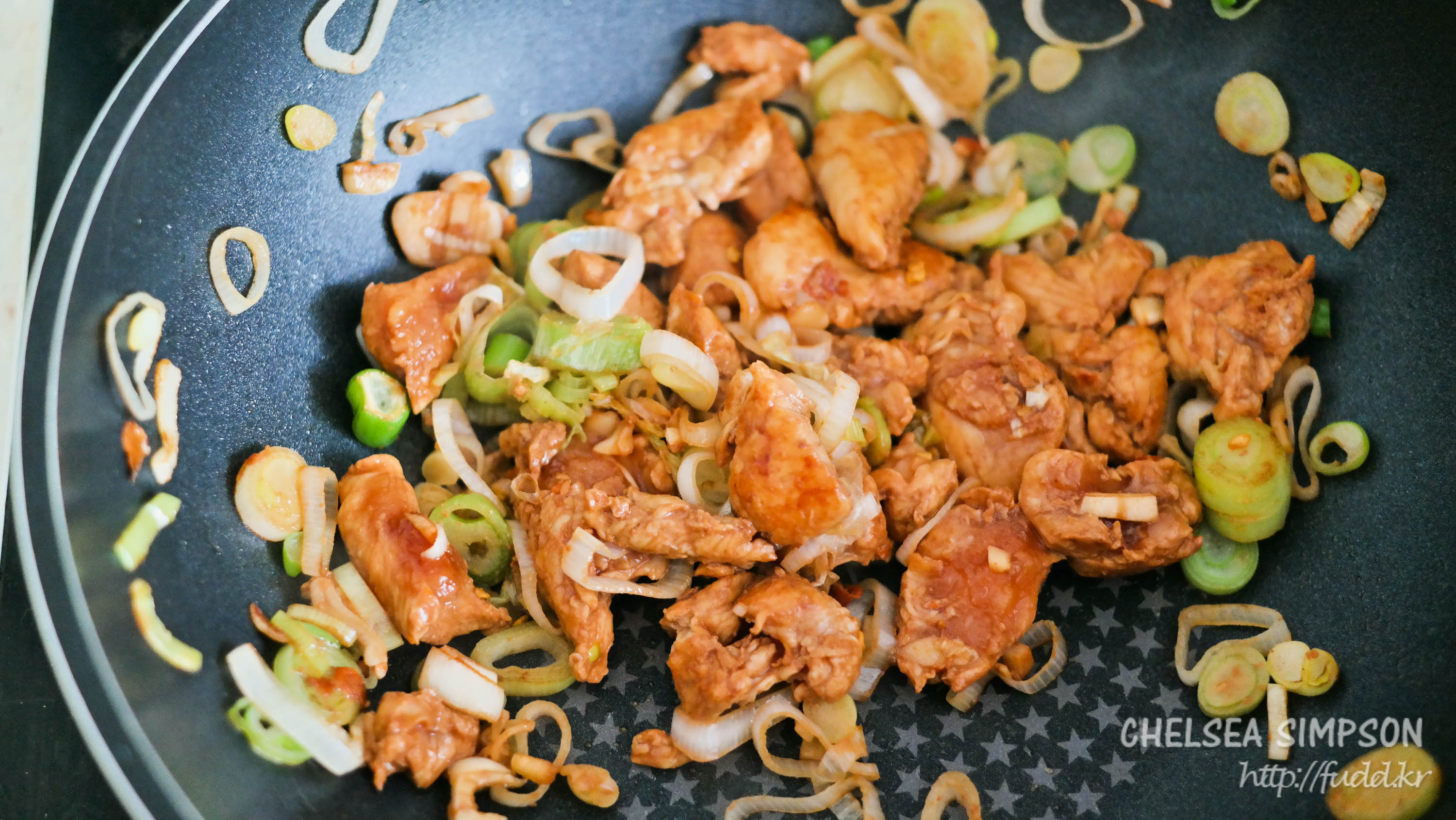 ⑤ 팬에 양념한 닭고기를 더하고 2-3분 볶는다.