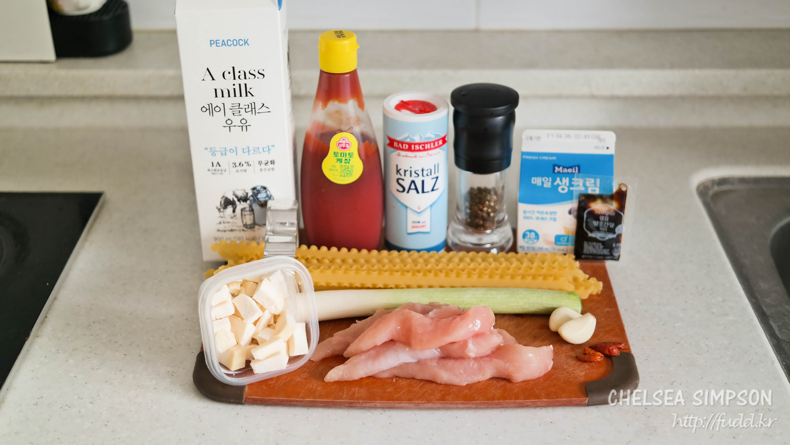 100g chicken tender breast, ½ stalk of green onion(30g), 1 tsp ketchup, ½ tsp soy sauce, 1 tsp minced garlic cloves, 3,4 peperoncini, 80-100g mafaldine pasta, 1 tsp salt for boiling water, 10g butter, 200ml heavy cream, 30g chopped hard cheese(Parmigiano or Grana Padano), milk, salt and pepper to taste