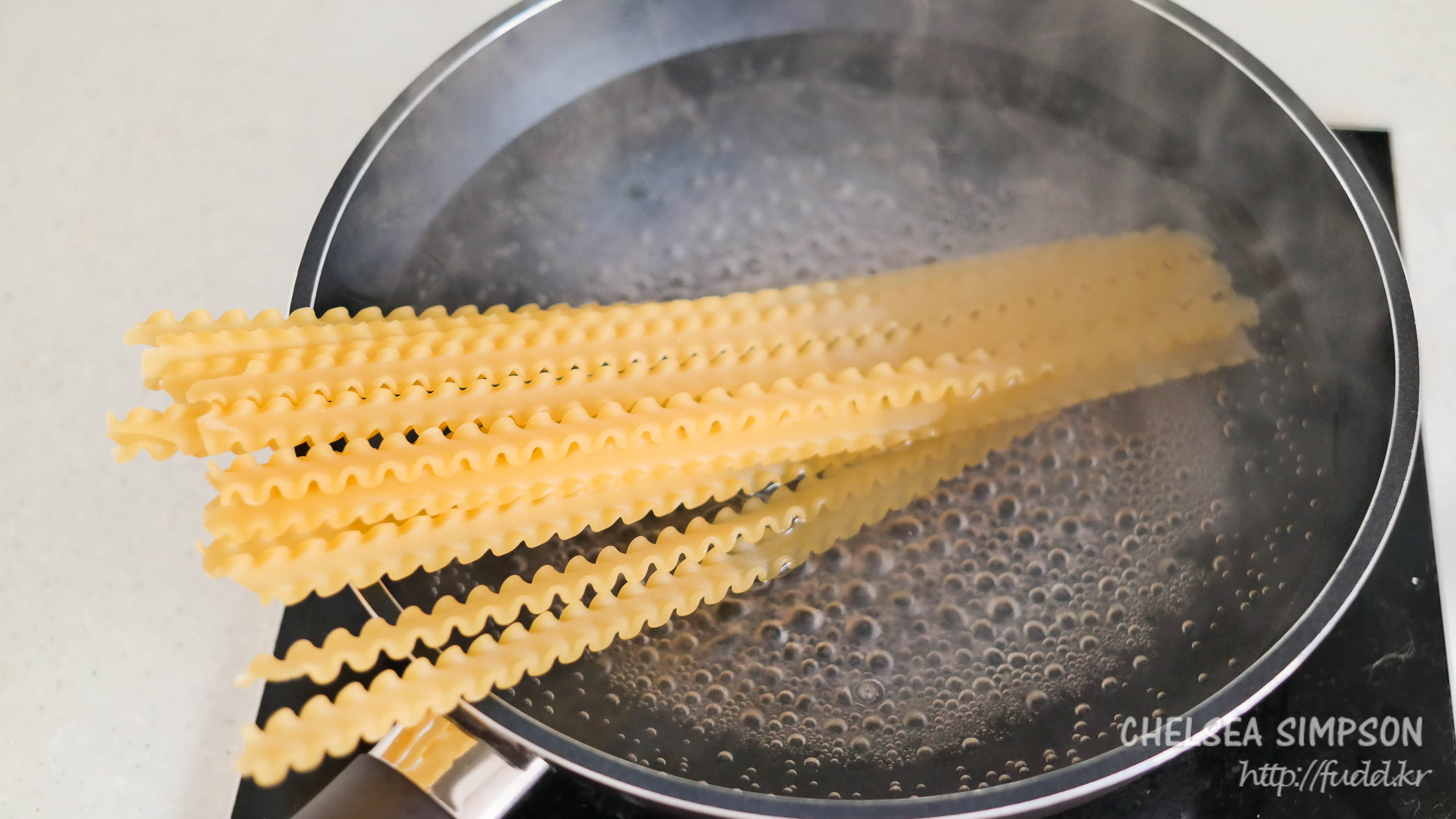 ③ 냄비에 물을 끓여 마팔디네와 소금 1작은술을 넣어 삶는다(조리 시간은 면 포장지 참고).