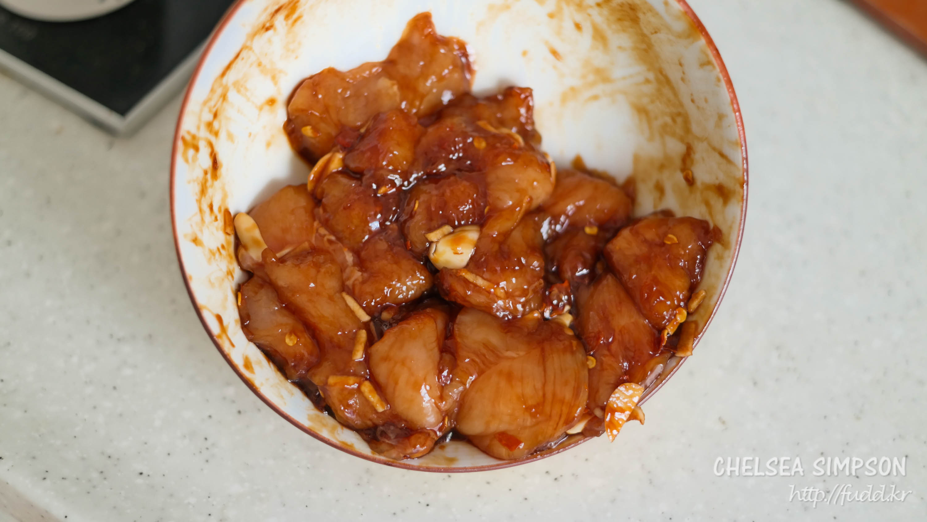 작은 볼에 닭고기, 케첩, 간장, 다진 마늘, 페페론치노를 넣어서 잘 주물러둔다.