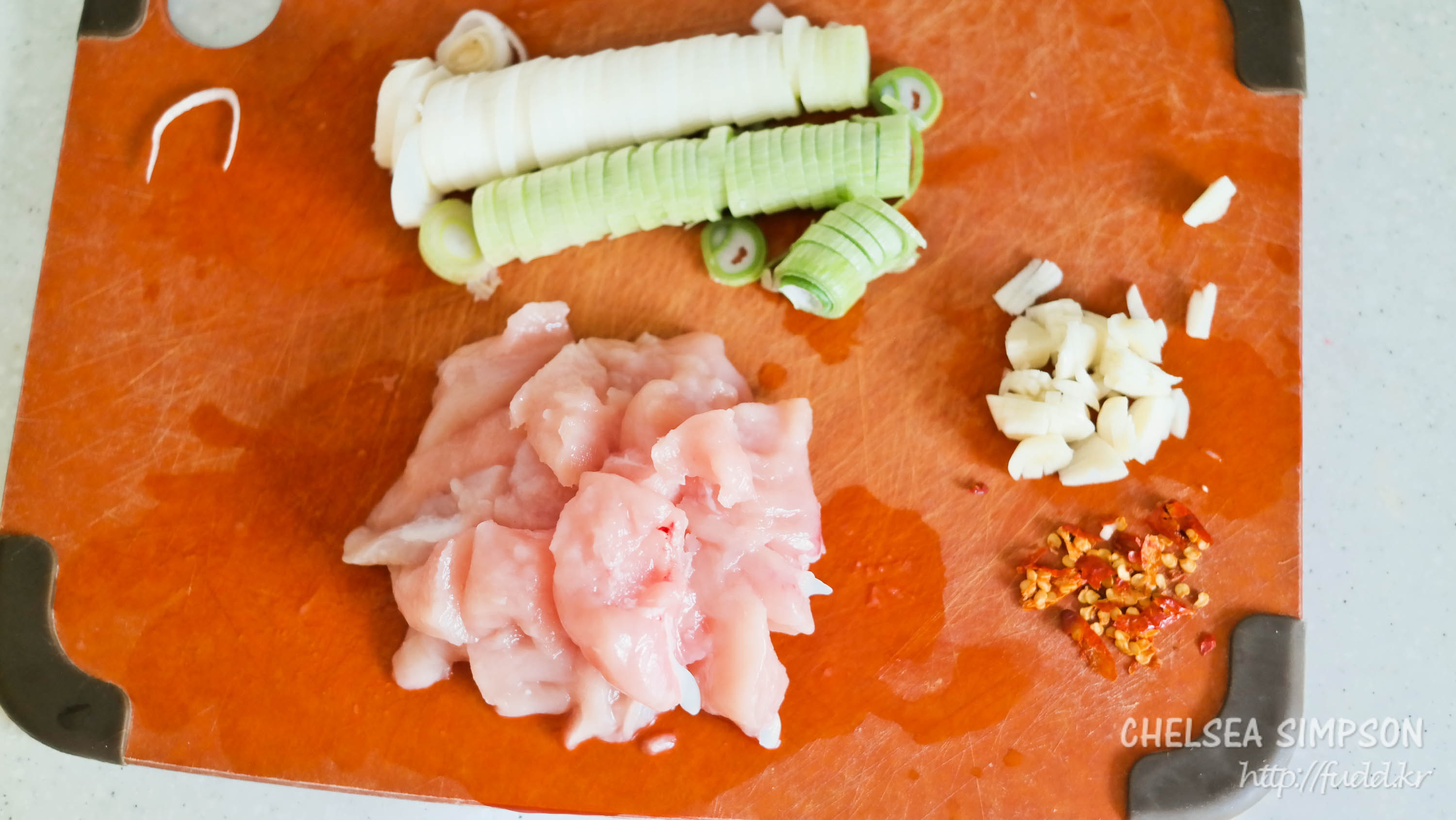 닭 안심을 먹기 좋은 크기로 자르고 대파를 잘게 썰고 페페론치노는 짓눌러 부순다.