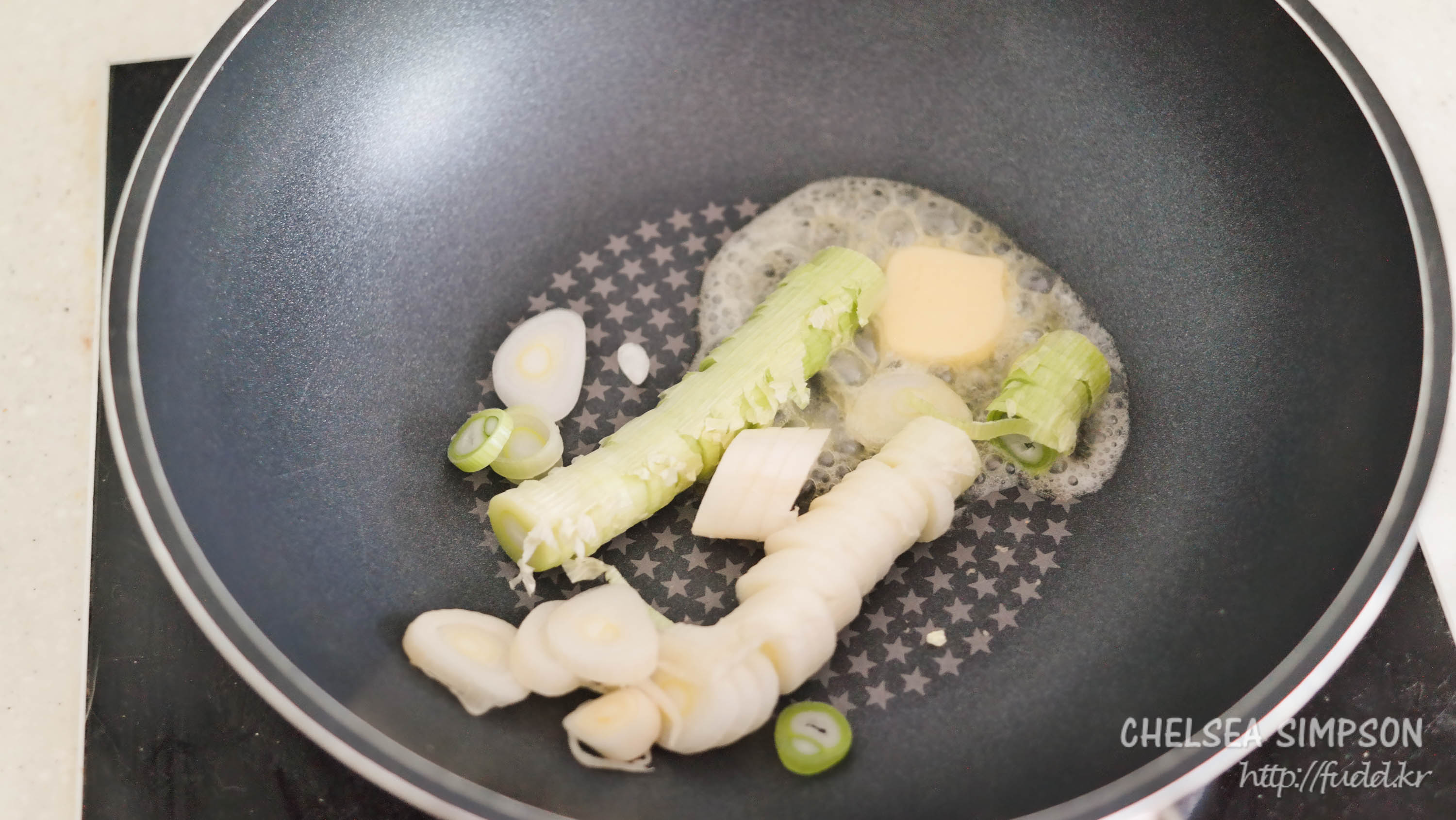 ④ 면을 삶는 동안 중강불로 달군 팬에 버터를 녹여 대파를 2-3분 볶는다.