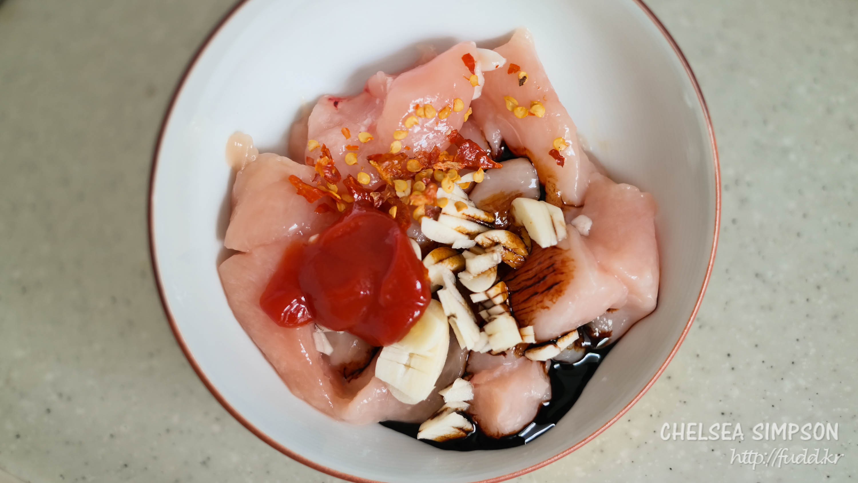 ② Season the chicken with ketchup, soy sauce and minced garlic and set it aside.