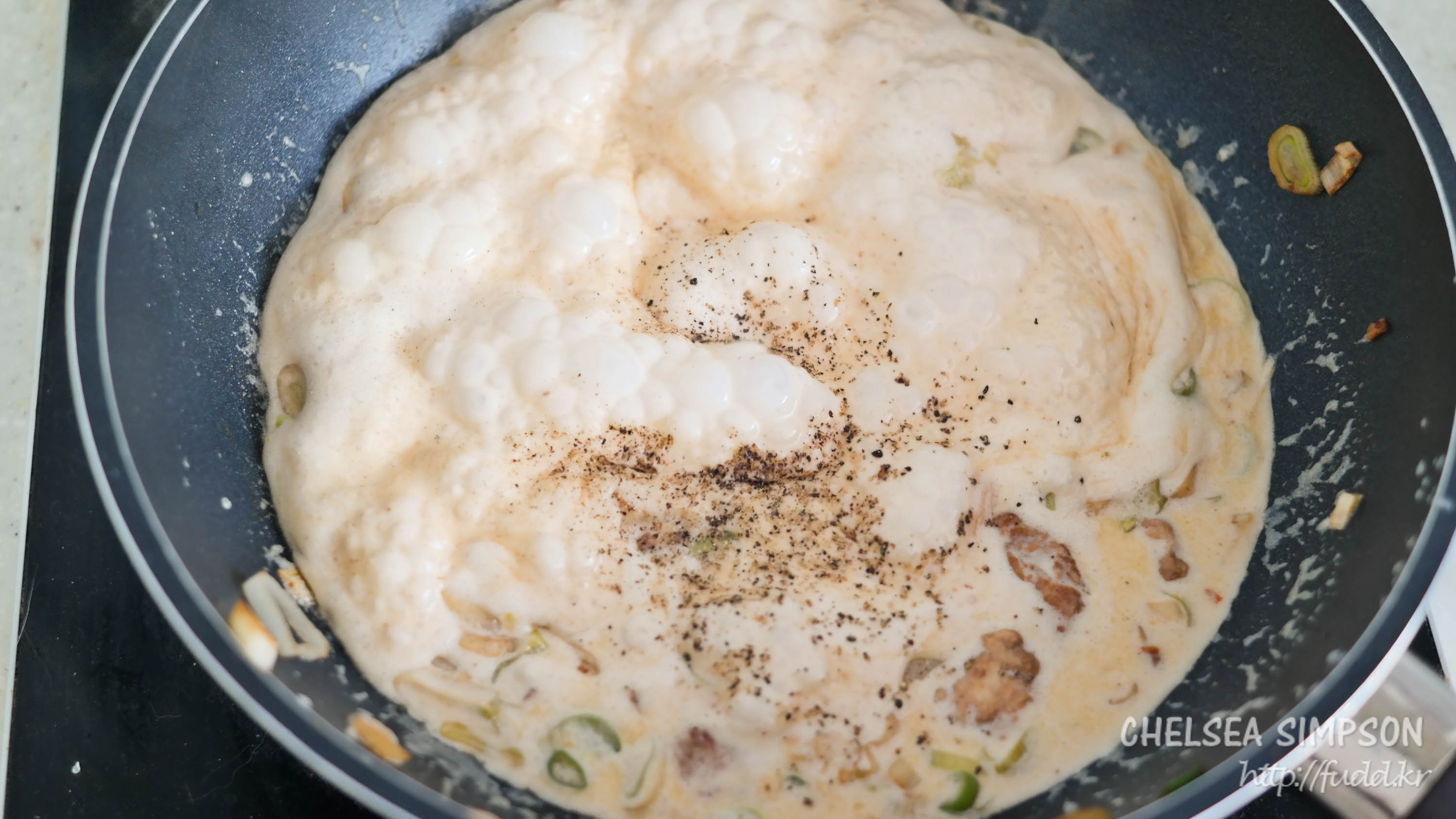 ⑦ 크림소스가 너무 걸쭉하면 농도를 우유로 조절하고, 맛을 본 뒤 기호에 따라 소금과 후추로 간한다.