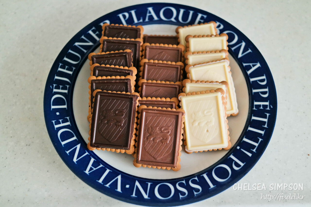 얇은 비스킷 사이에 두툼한 초콜릿을 끼운 제품이다.