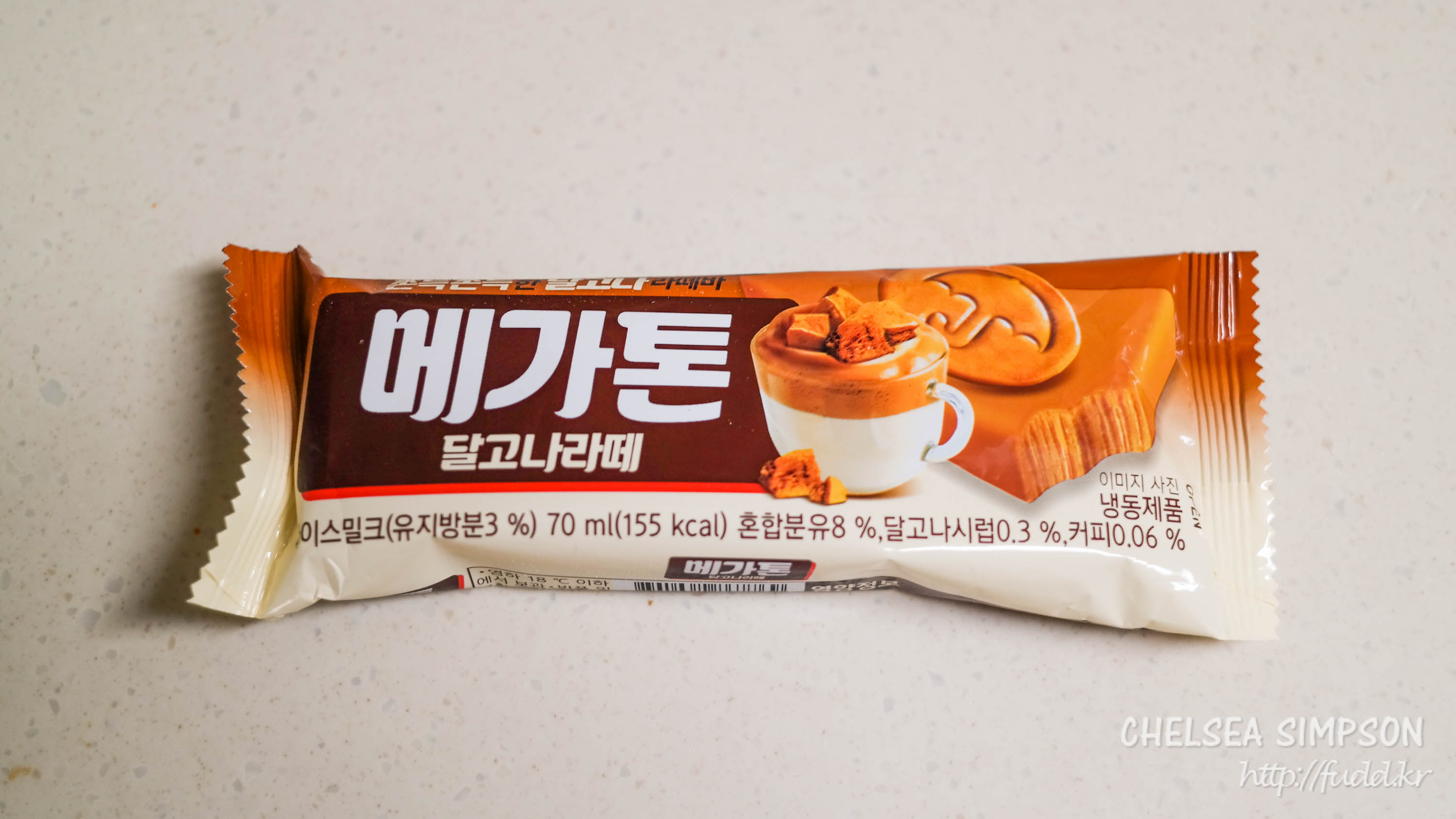 캐러멜맛 아이스크림 메가톤 바에 달고나시럽을 넣은 제품이다.