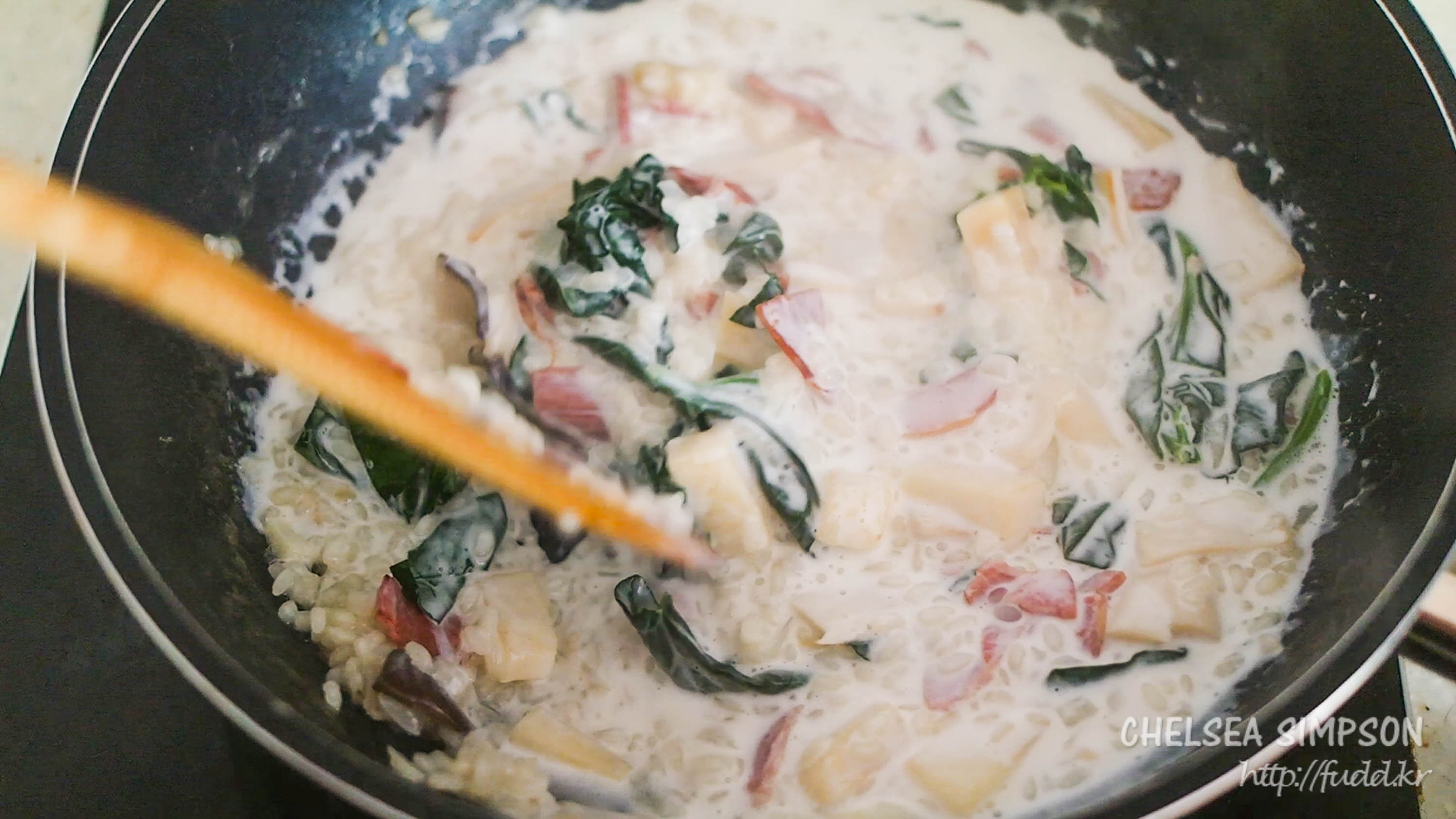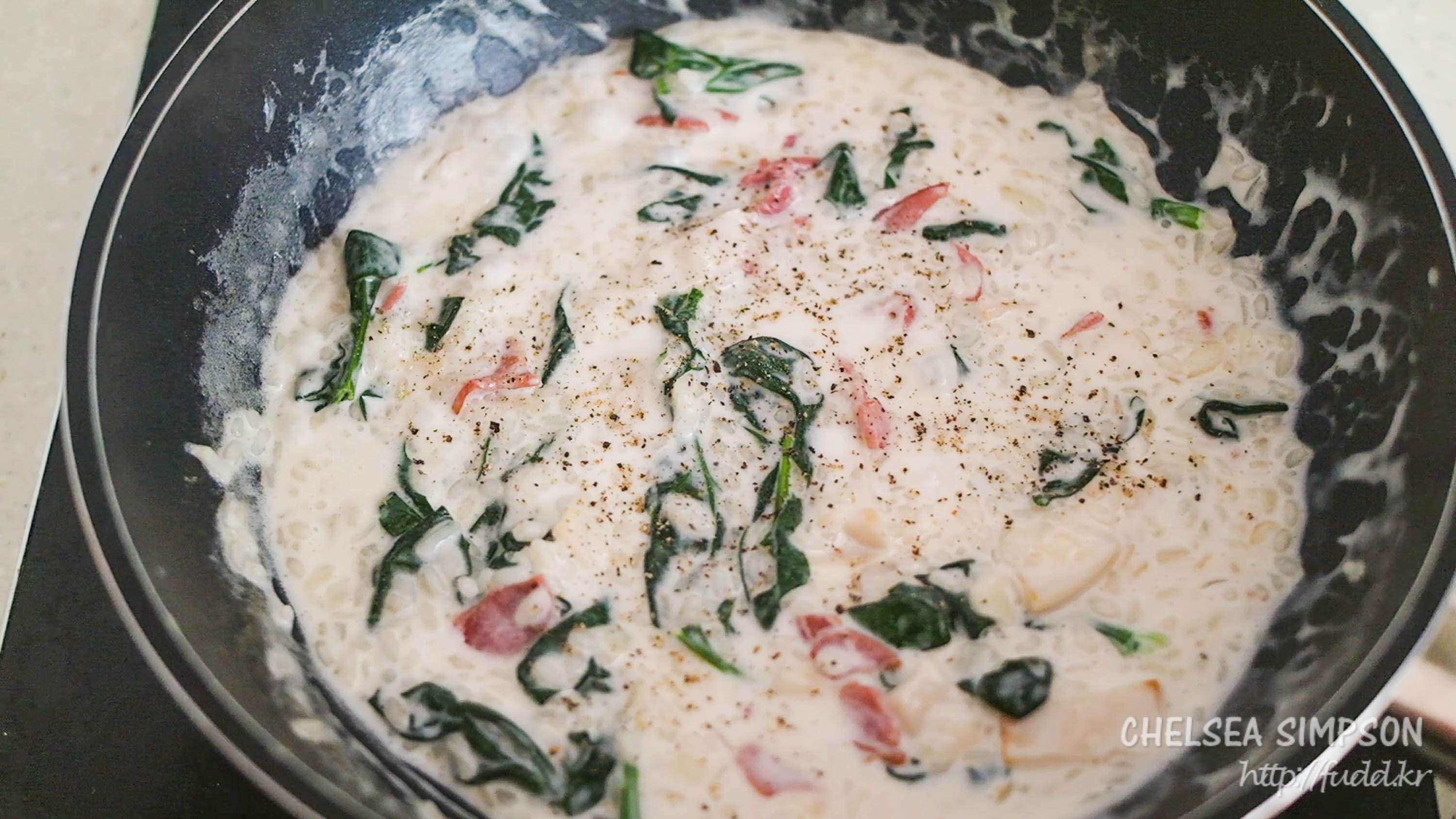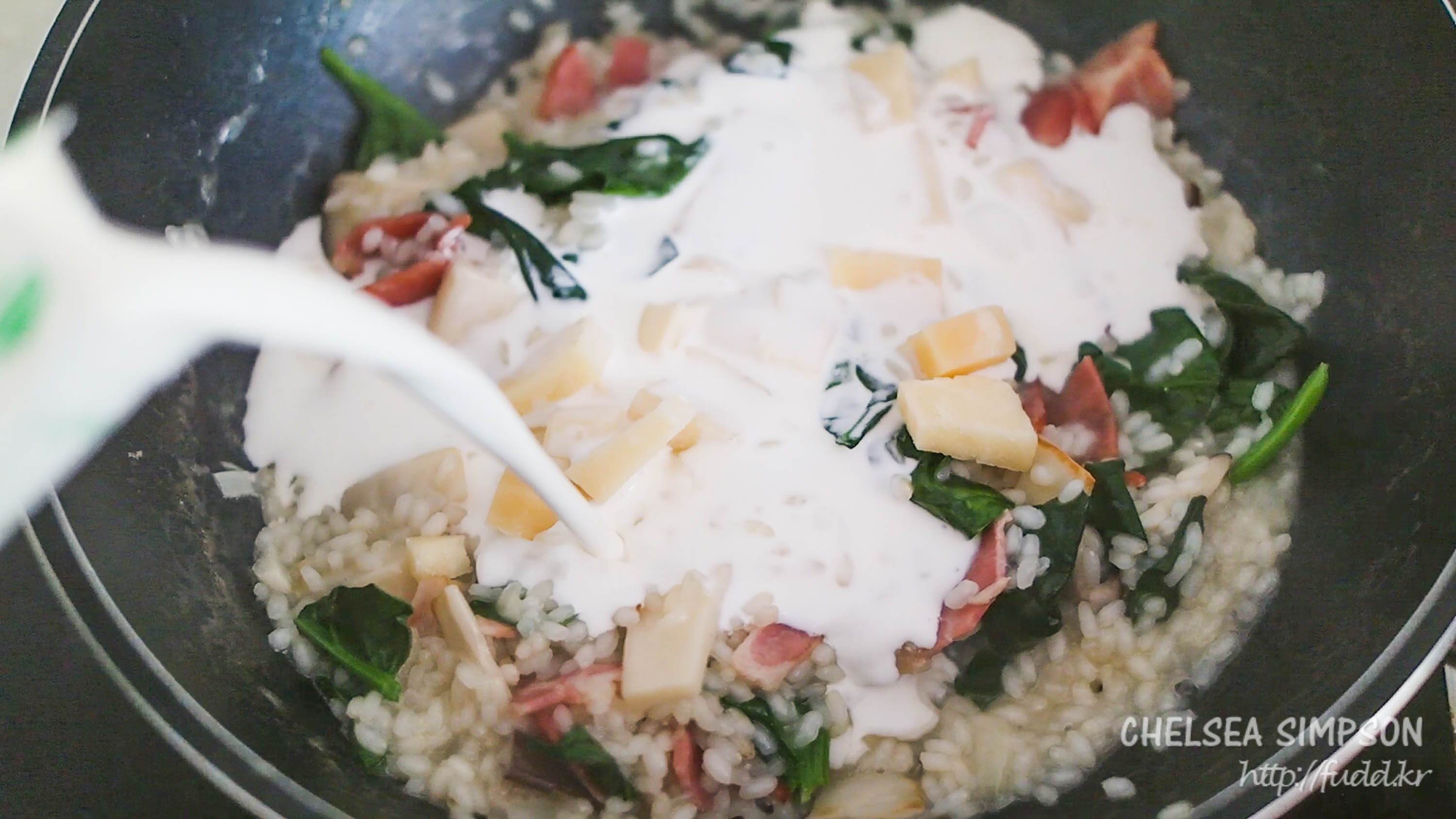 생크림과 치즈를 넣은 뒤 잘 저어가며 2-3분 정도 끓여 쌀을 알 덴테*로 익힌다.