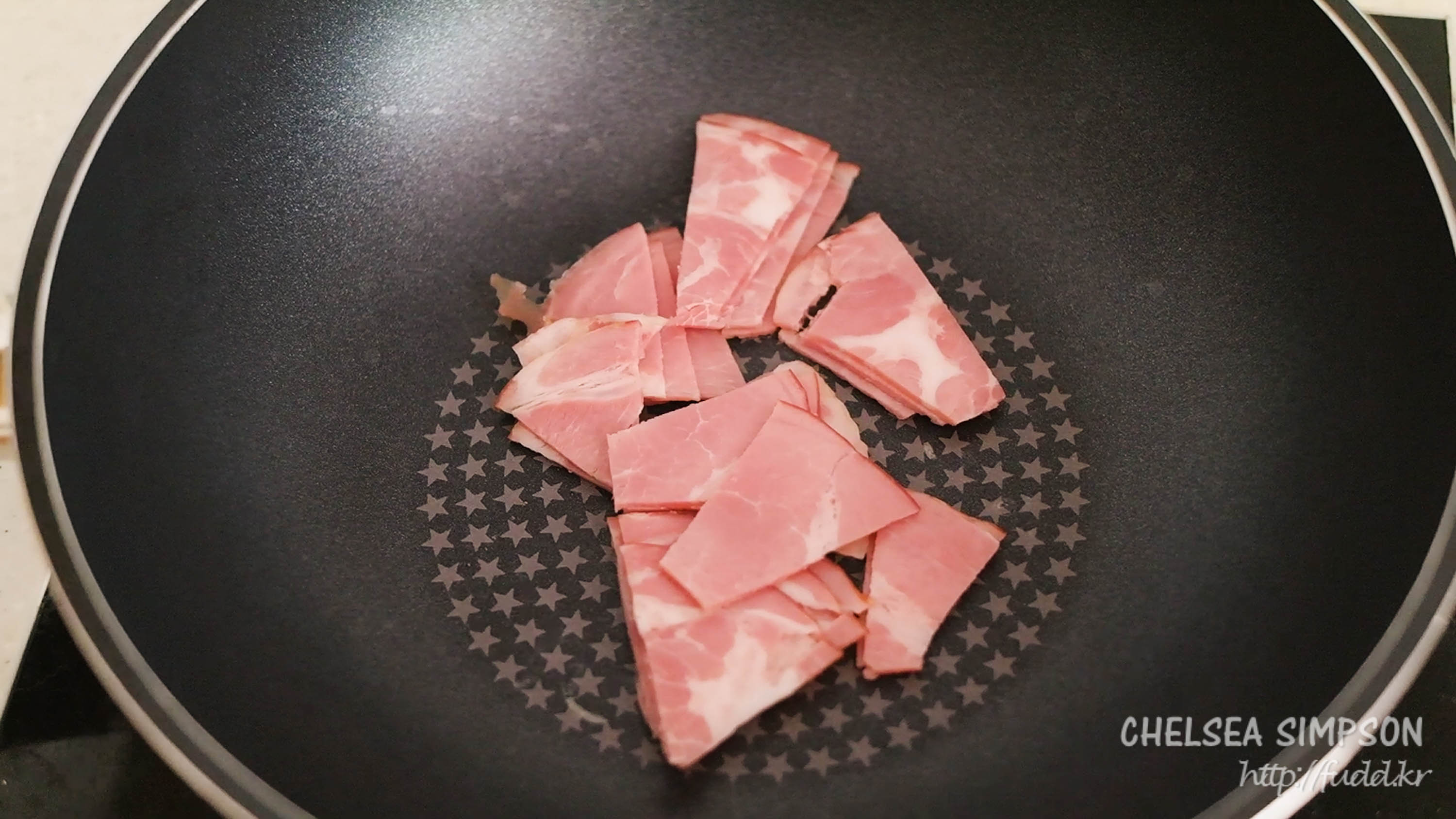 ② 중불로 달군 팬에 베이컨을 넣어 기름이 배어나오게 1-2분 볶는다.