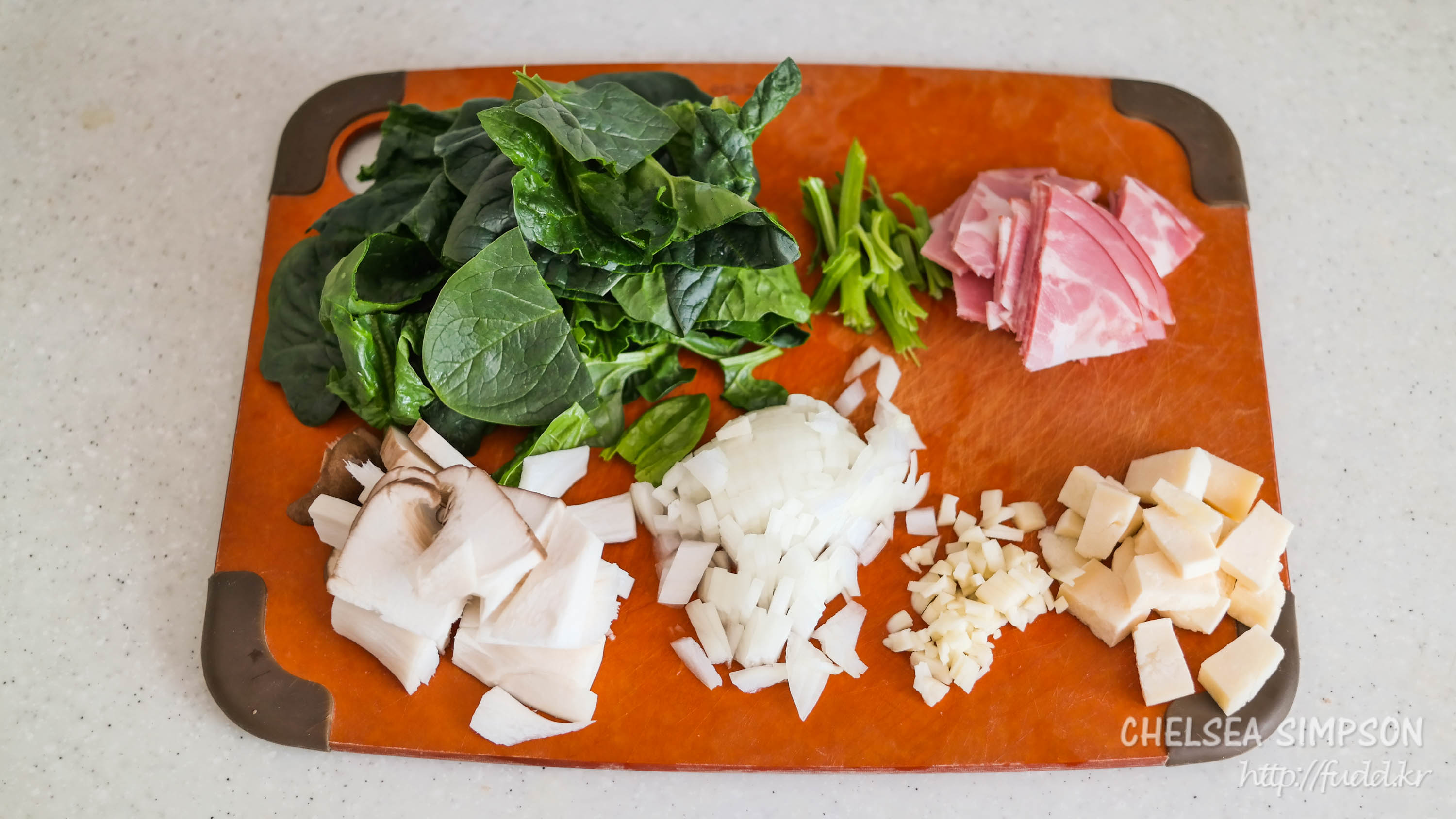 마늘은 다지고, 양파와 치즈는 잘게 썰고, 베이컨, 버섯, 시금치 잎은 한입 크기로 썬다.