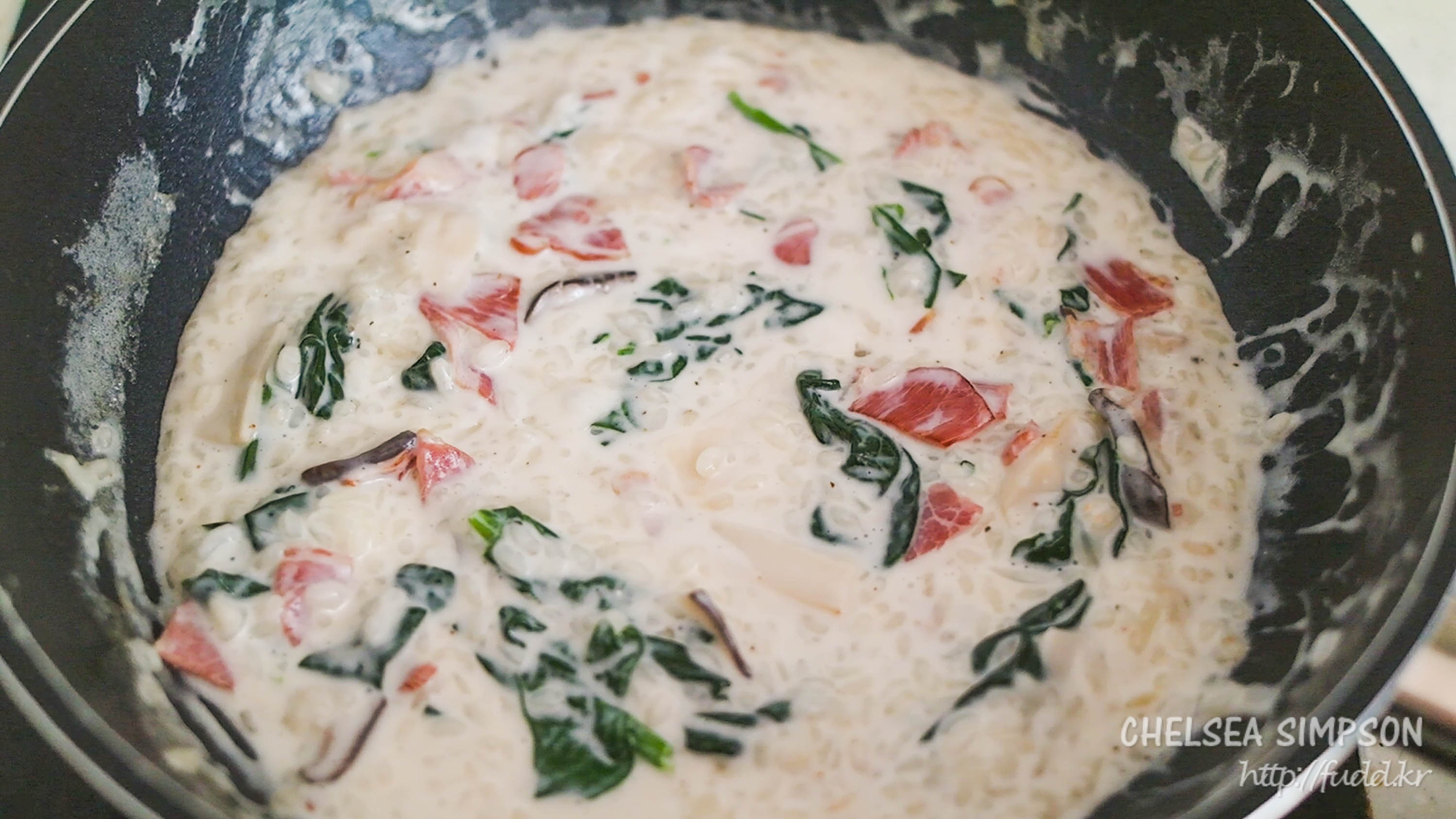 나는 그냥 집에 있는 백진주쌀을 썼는데 이 쌀도 차진 품종이어서 충분히 크리미했다.