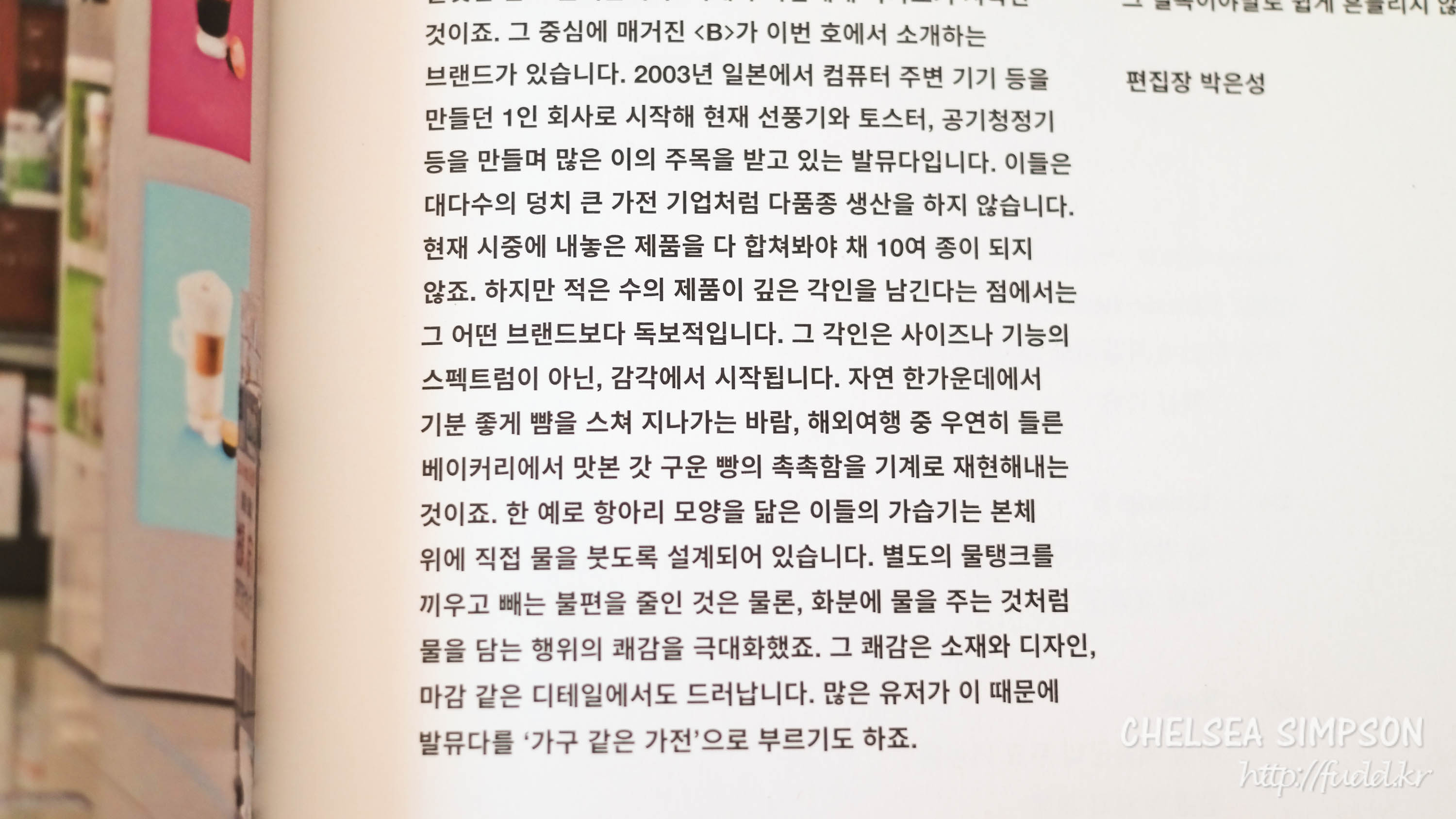 이번 <B>를 읽으면서 역시나 아쉬웠던 부분은 브랜드 소개와 인터뷰 부분이었다. 다양한 시각에서 바라본 발뮤다에 대해 읽고 싶었는데 브랜드 설명은 현학적 수사가 가득한 문장들로 피로를 유발했고, 인터뷰는 발뮤다에 대한 칭송 쪽으로 쏠려 있었다. 내가 읽고 싶었던 건 팬레터가 아니라 분석과 평가였는데 이런 부분이 부족해서 실망스러웠다.