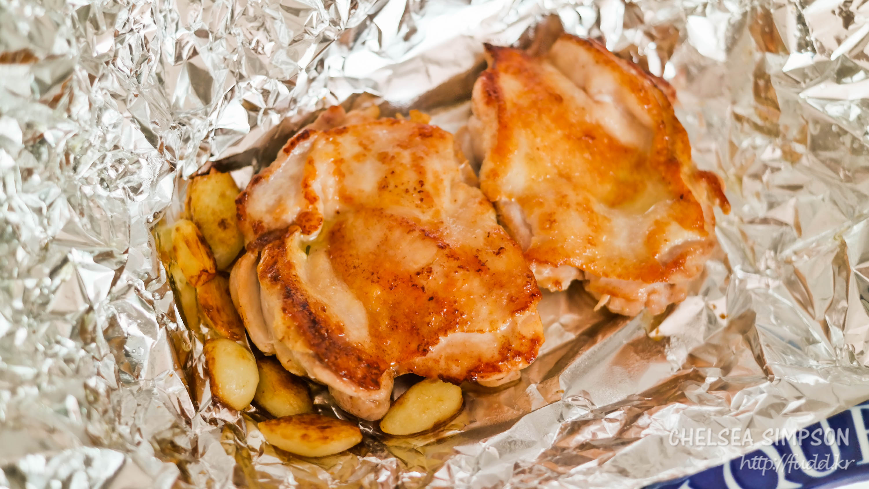 ④ 호일에 닭다리살을 놓고 마늘과 함께 감싸서 3분 정도 그대로 두어 레스팅한다.