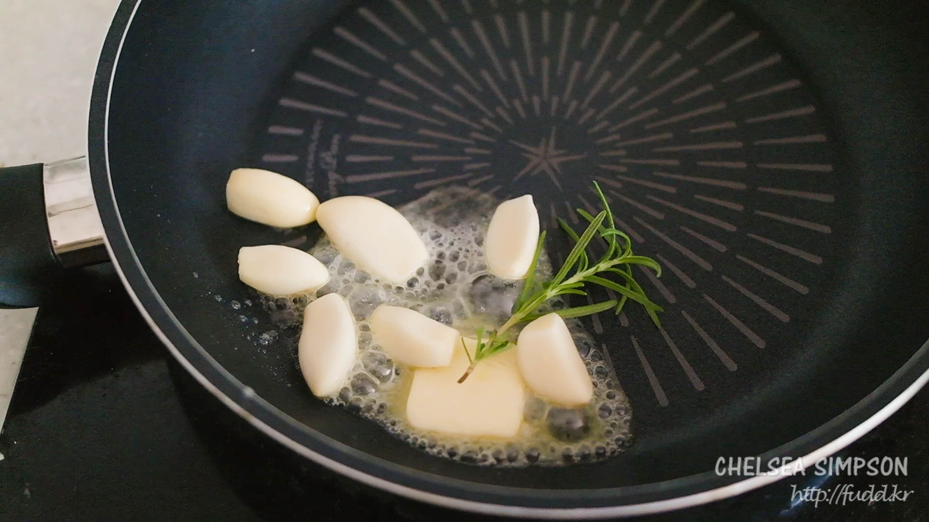 ① 중강불로 달군 팬에 버터를 녹이고 마늘과 로즈마리를 넣어 향을 낸다.