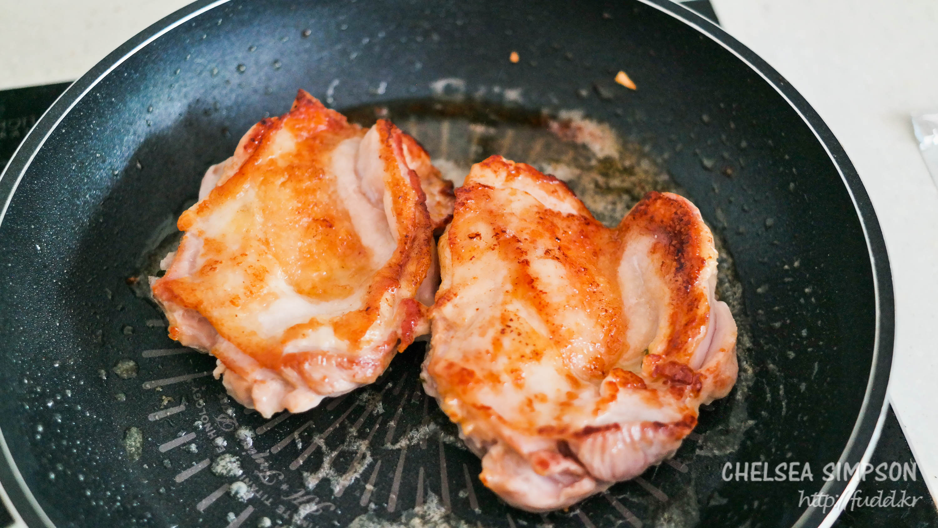 치킨 소테는 대개 닭고기에 밀가루나 전분을 입힌 뒤 버터 두른 팬에 굽지만, 나는 집에 밀가루도 전분도 없다.
