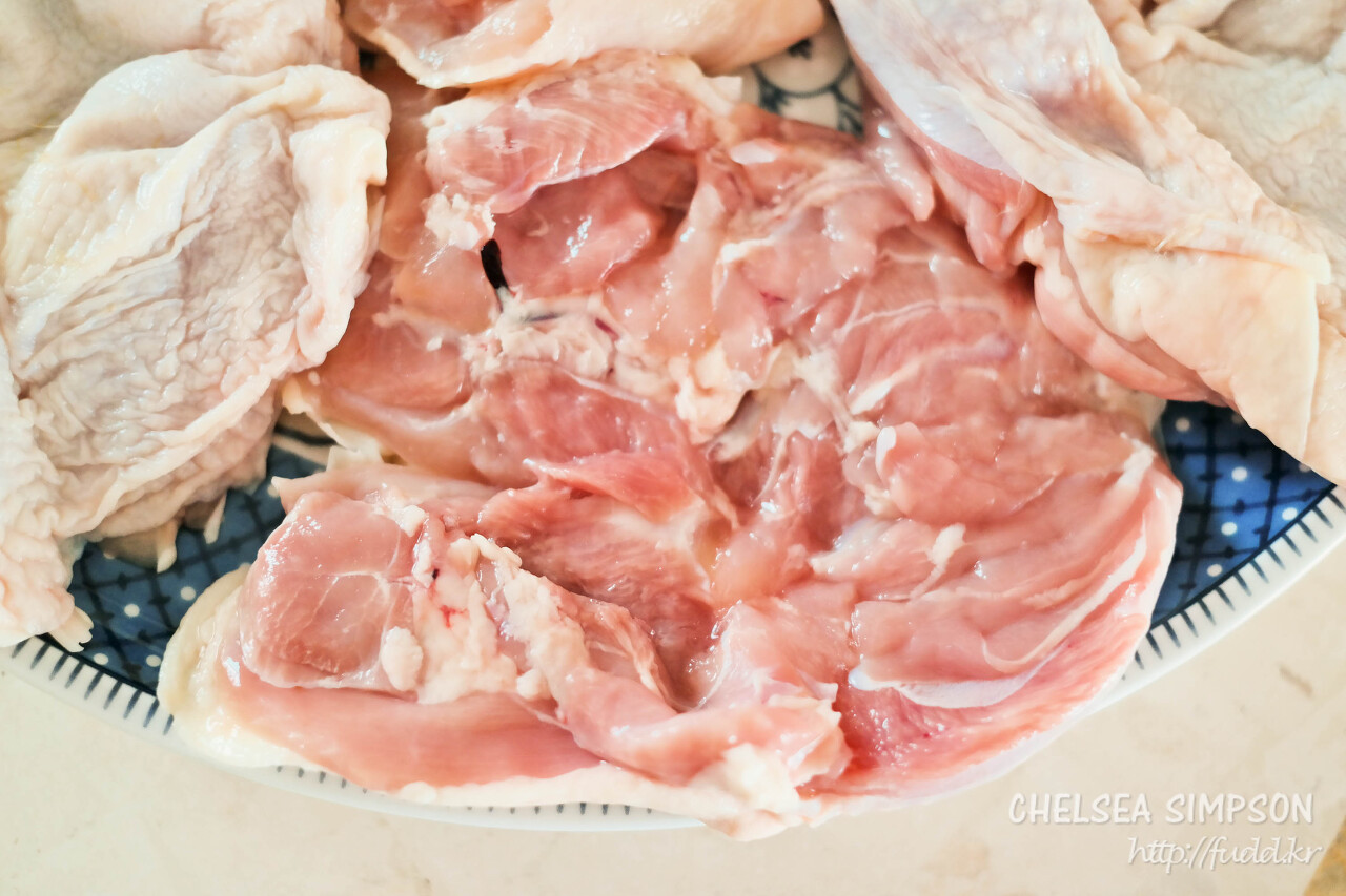 이 레시피는 닭다리살 외에 닭가슴살을 써도 잘 어울리고, 고기 양을 조절할 거라면 소금도 맞춰서 가감하는 게 좋다.