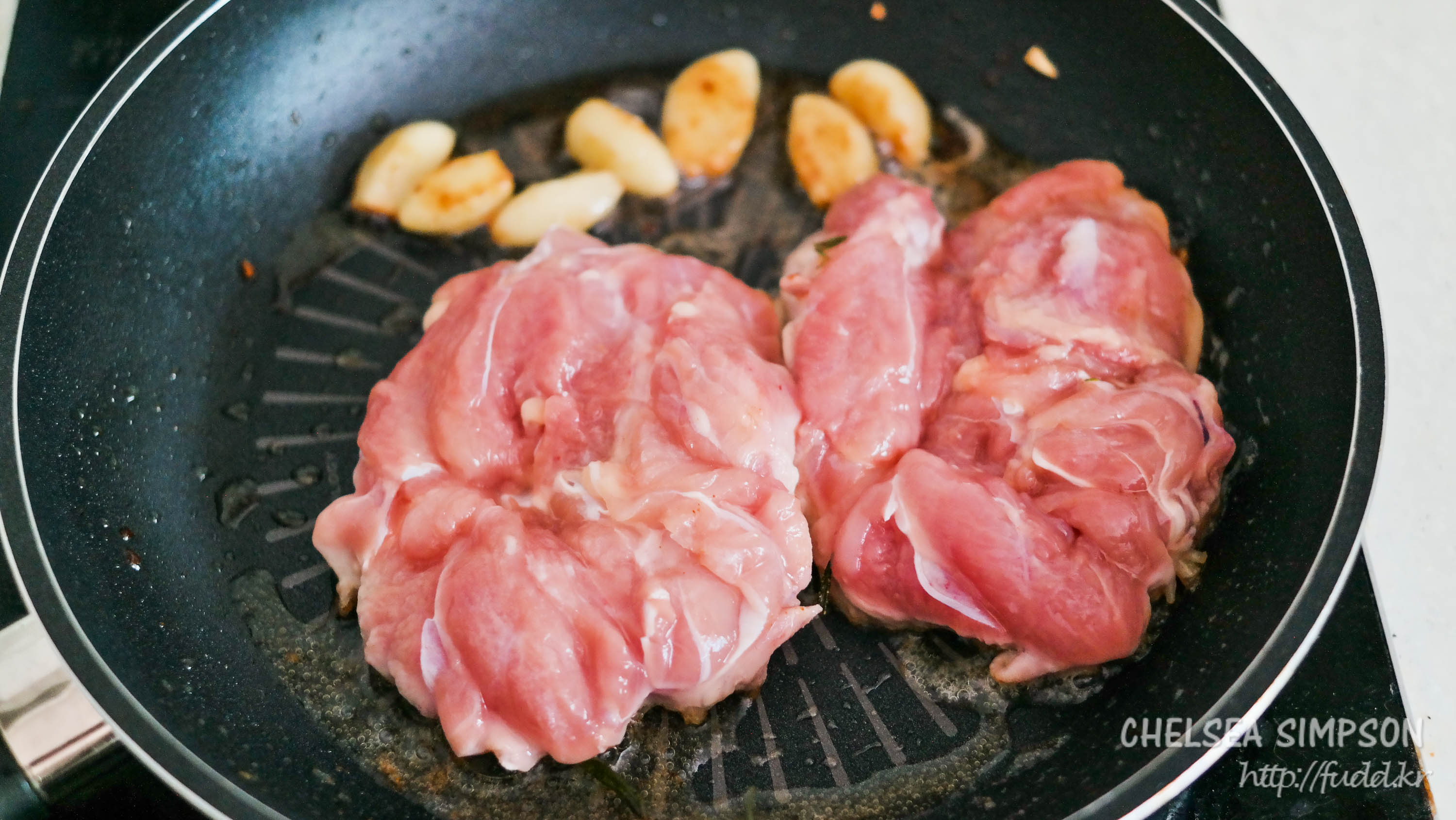 ② Place chicken skin side down in the skillet, cook for 5 mins and removed the garlic.