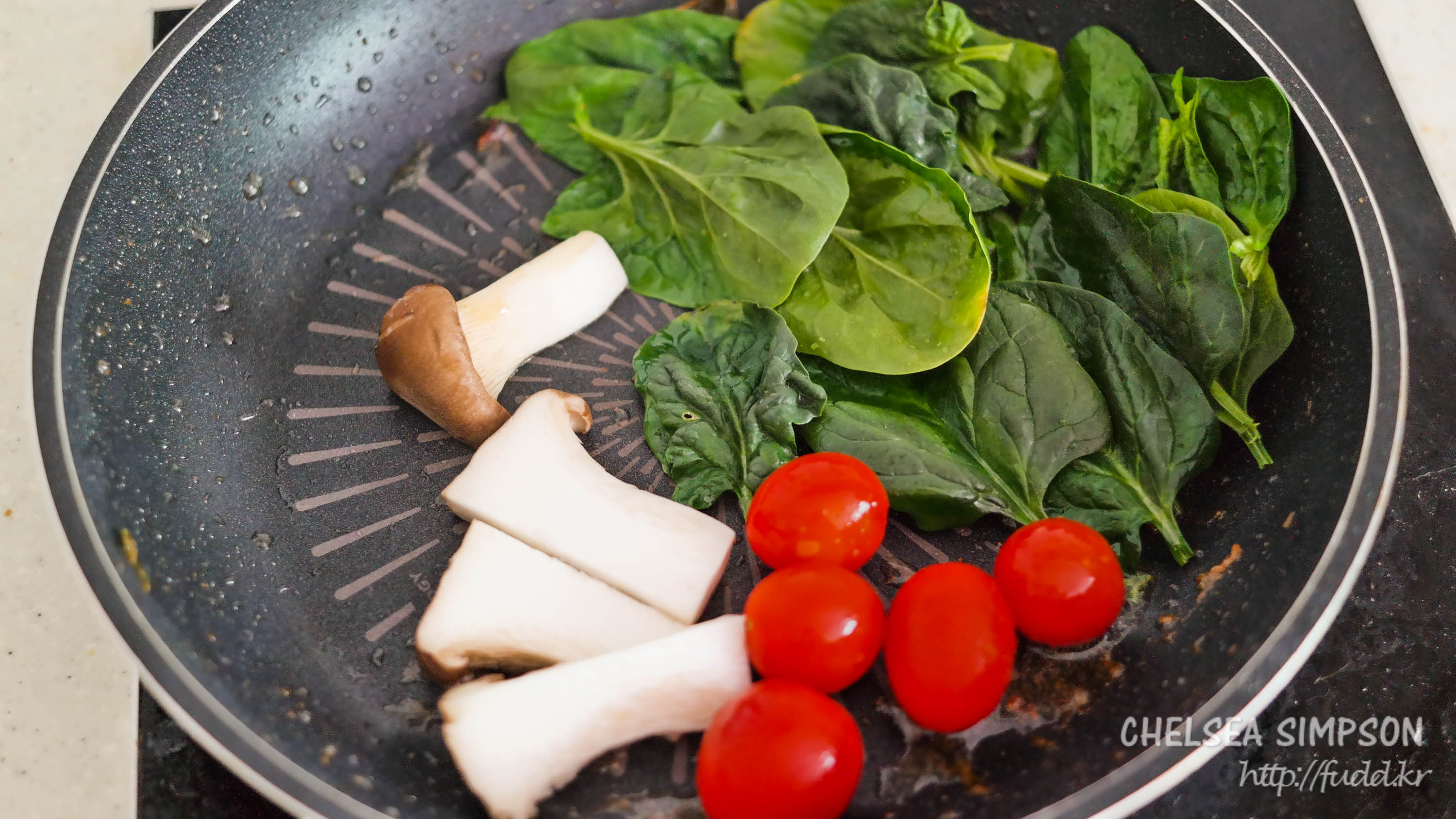 아까 닭을 구운 팬의 불을 약하게 줄이고, 손질해둔 버섯, 토마토, 시금치를 넣은 뒤 3분 정도 볶아 곁들임을 만든다.