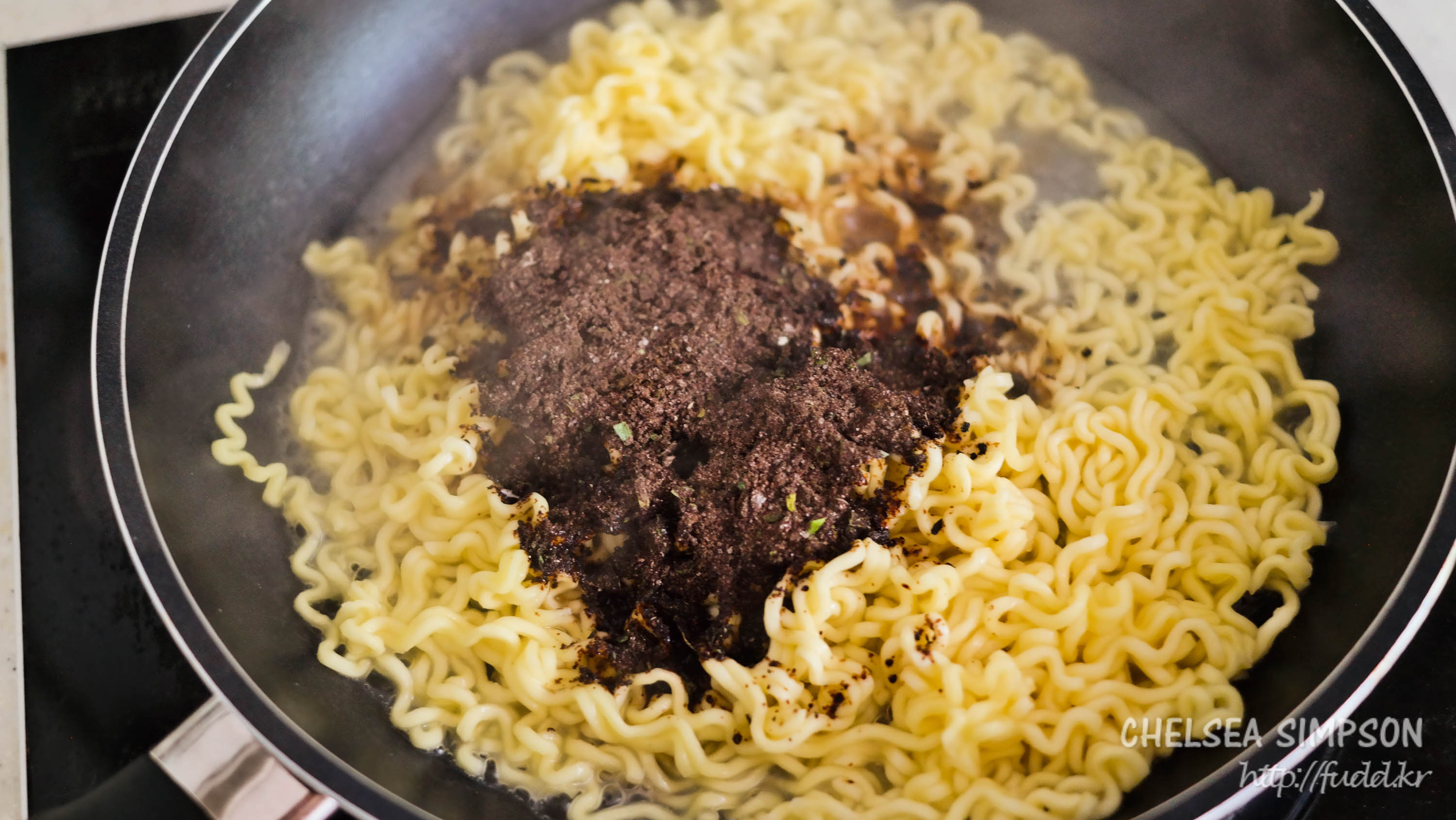 5분 끓인 뒤 물이 거의 잦아들어서 짜장스프를 넣어 재빠르게 비볐다.