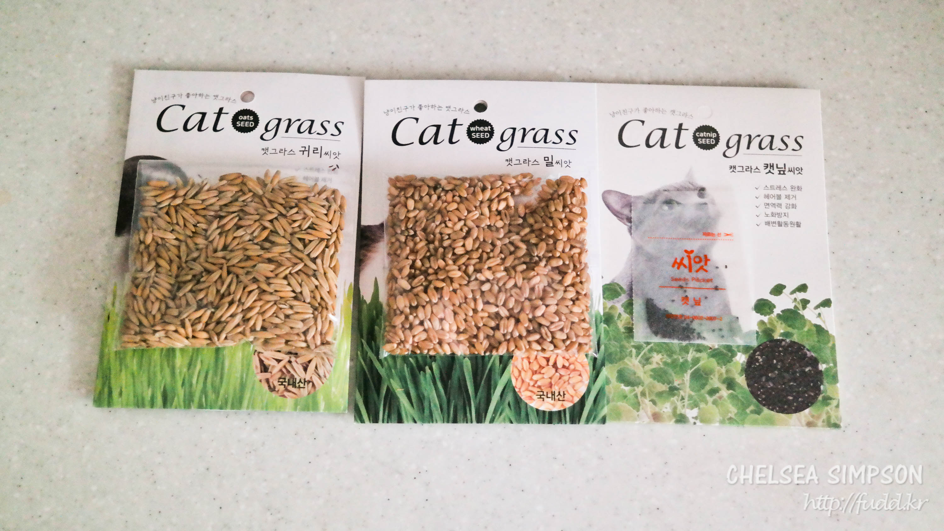 왼쪽부터 꿈쟁이 캣그라스 귀리 씨앗(70g, 정가 2,000원), 밀 씨앗(70g, 정가 2,000원), 캣닢 씨앗(13g, 정가 2,000원).