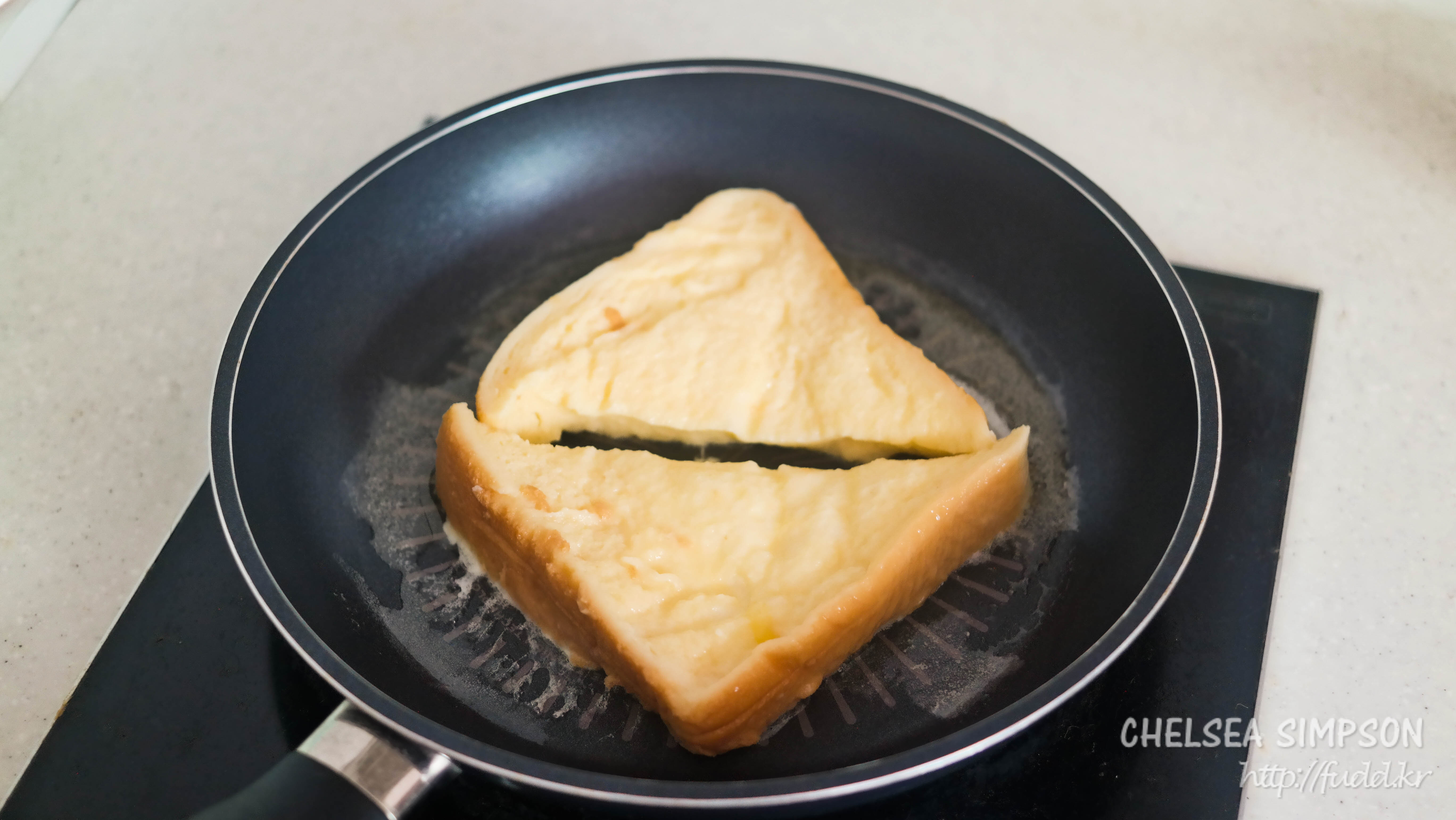 달걀물 적신 빵을 올려 앞뒤로 노릇하게 굽는다.