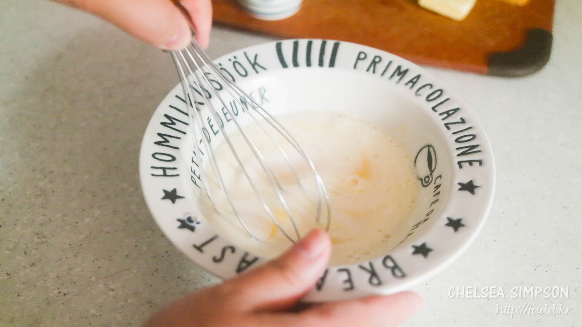 ② 풀어놓은 달걀에 우유를 붓고 휘저어 잘 섞어준다.
