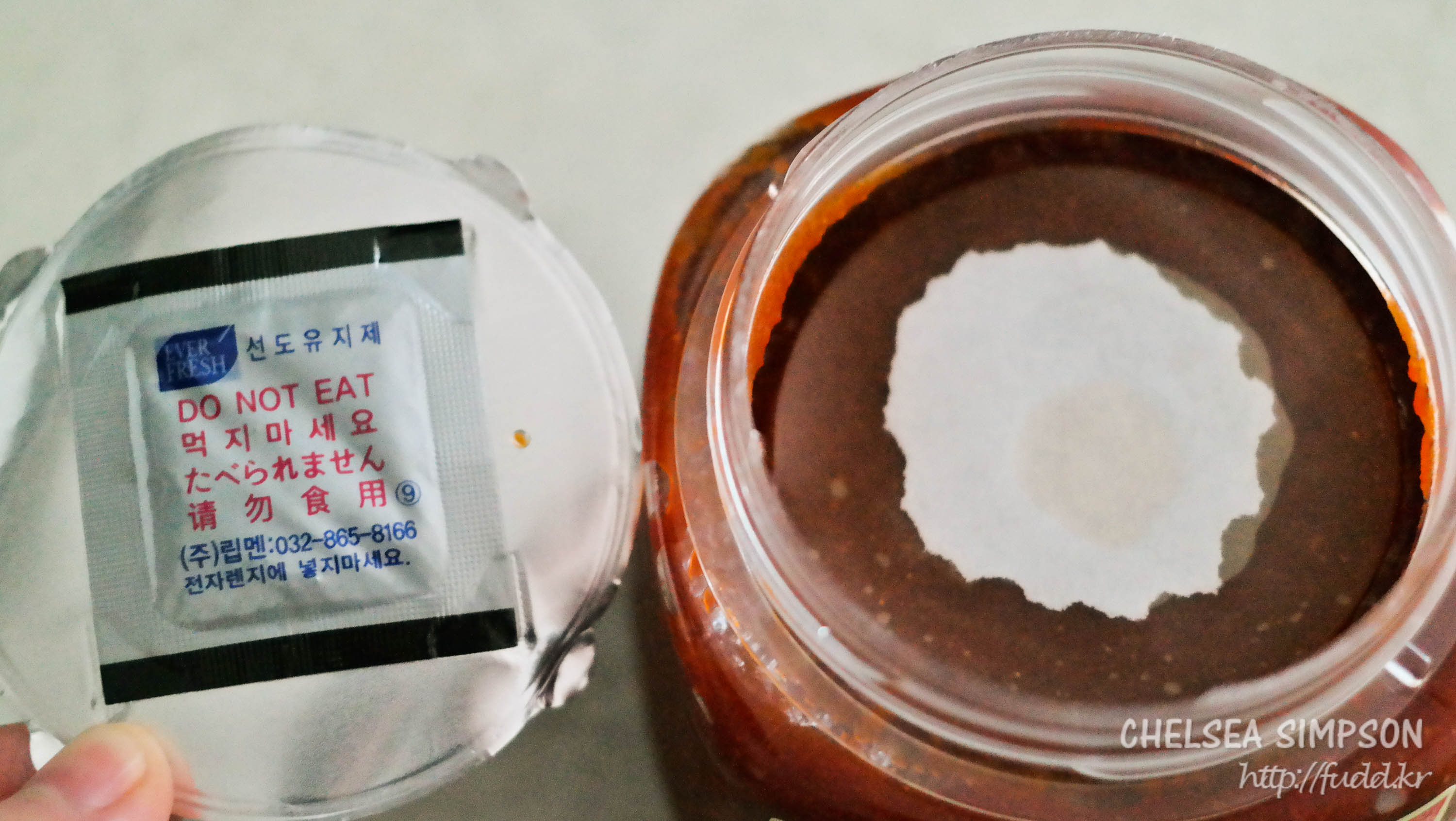씰 안쪽에는 선도유지제가 붙어있고 쌈장 위에 포장재가 한 장 올라가있다.