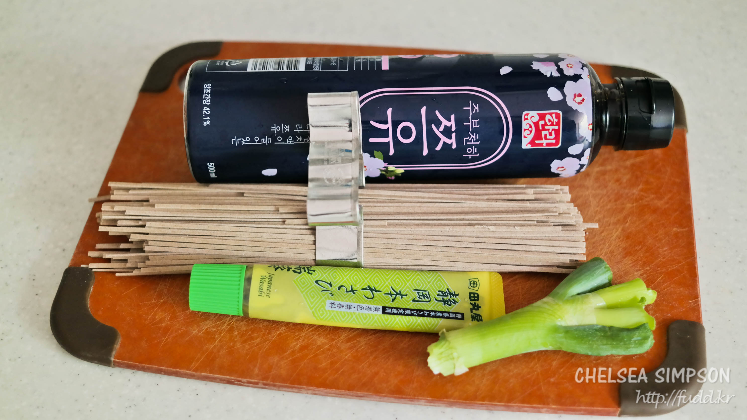 메밀국수와 쯔유 또는 국수장국은 필수, 대파와 와사비는 기호에 따라 생략해도 된다.