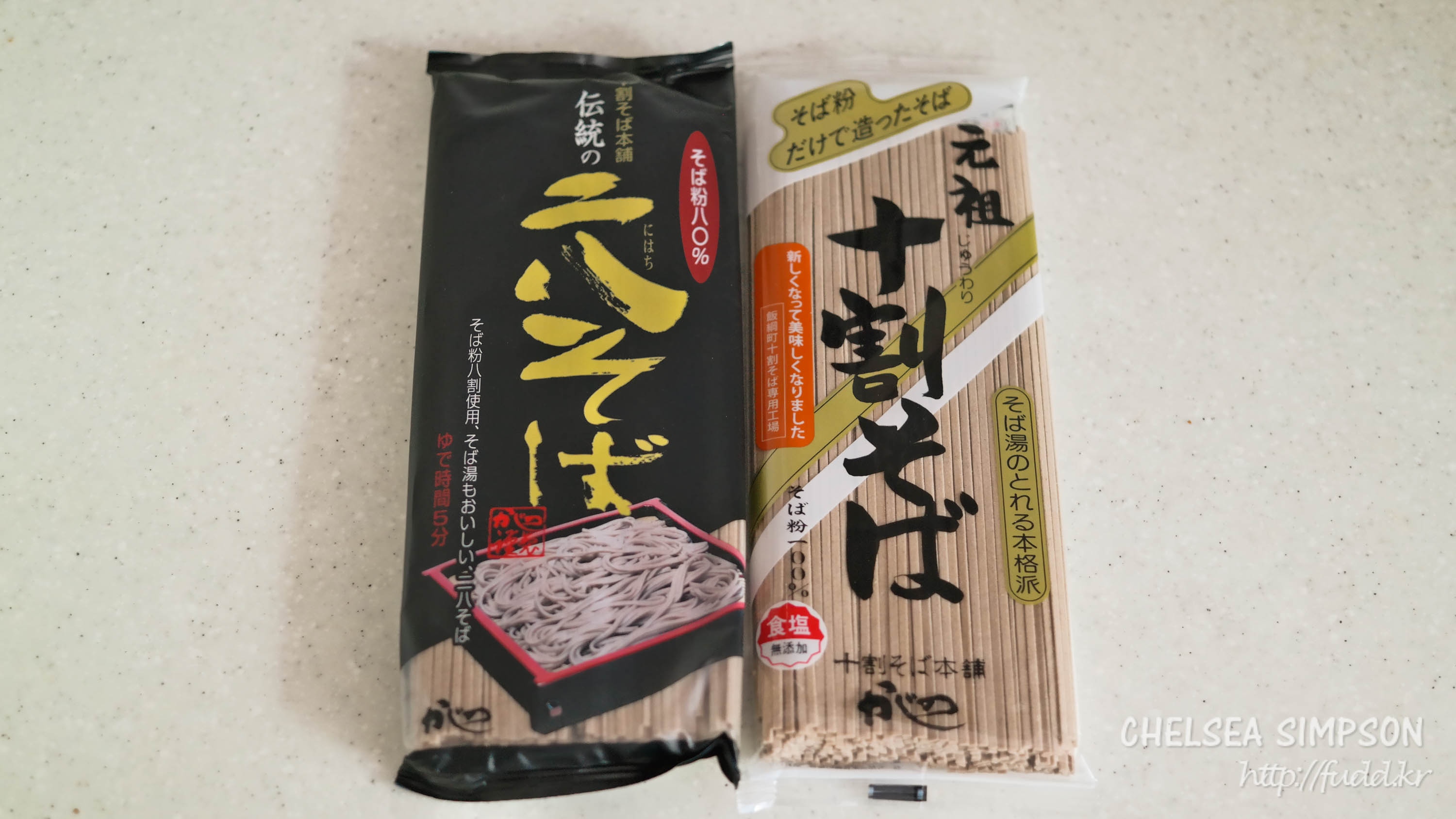 왼쪽은 메밀이 80% 들어간 니하치(二八), 오른쪽은 메밀이 100% 들어간 쥬와리(十割) 소바이다.