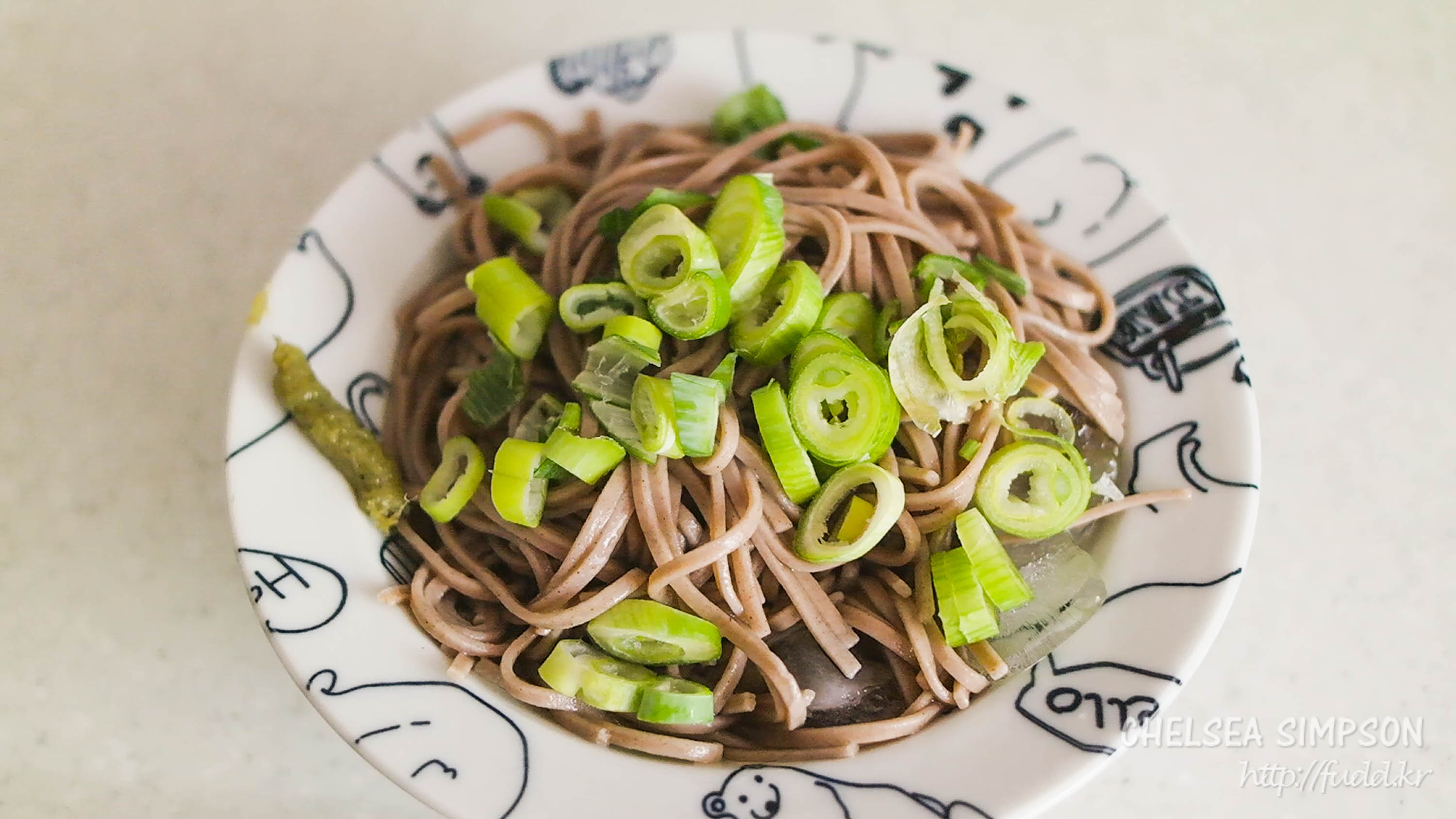 ⑤ 식힌 메밀면을 그릇에 넣고 파와 와사비를 곁들여 마무리한다. ♬