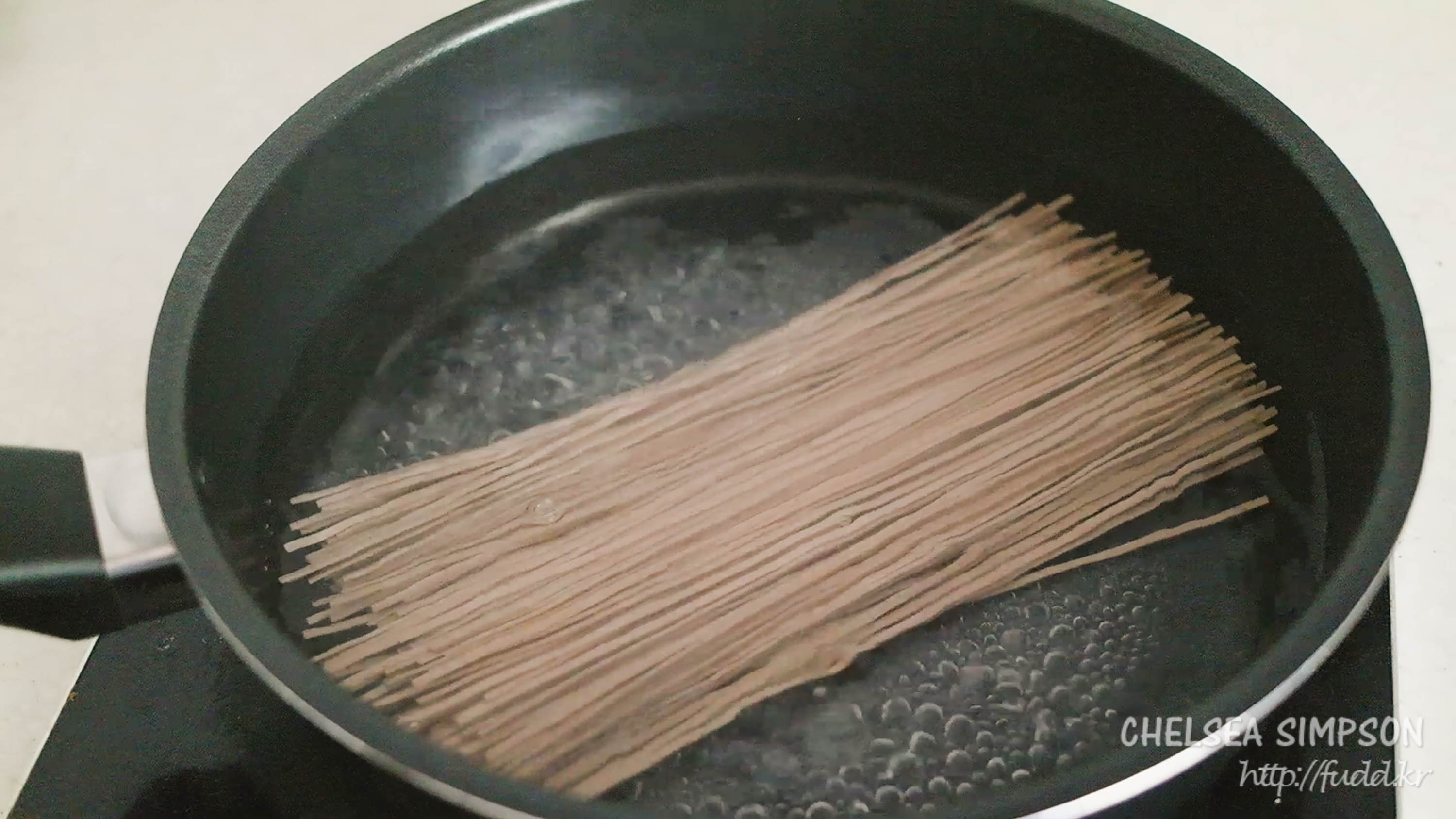 냄비에 물을 끓여 메밀 건면을 넣고 삶는다.