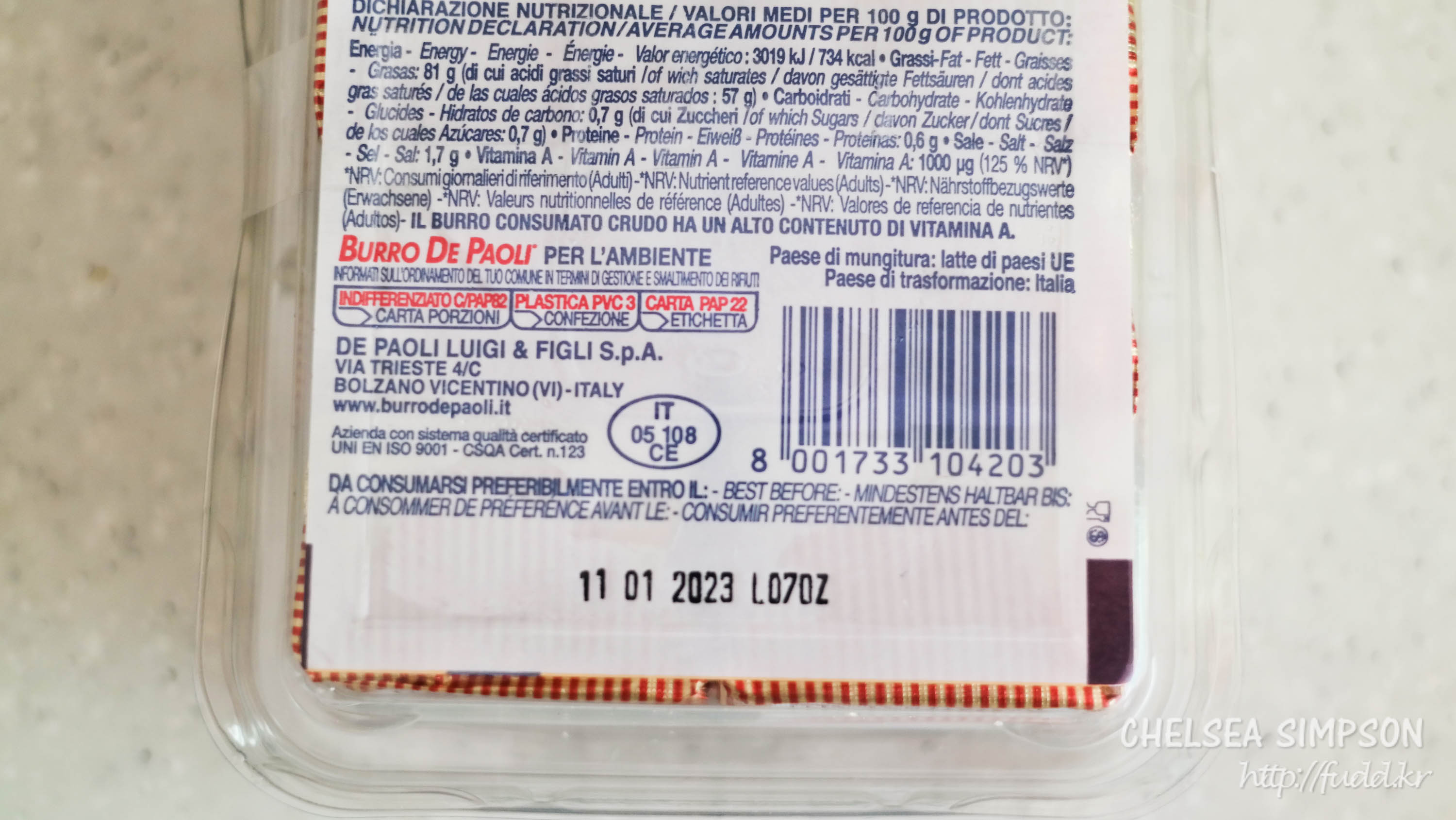 이탈리아산 제품이고 원재료는 유크림, 소금 1.7%, 젖산.