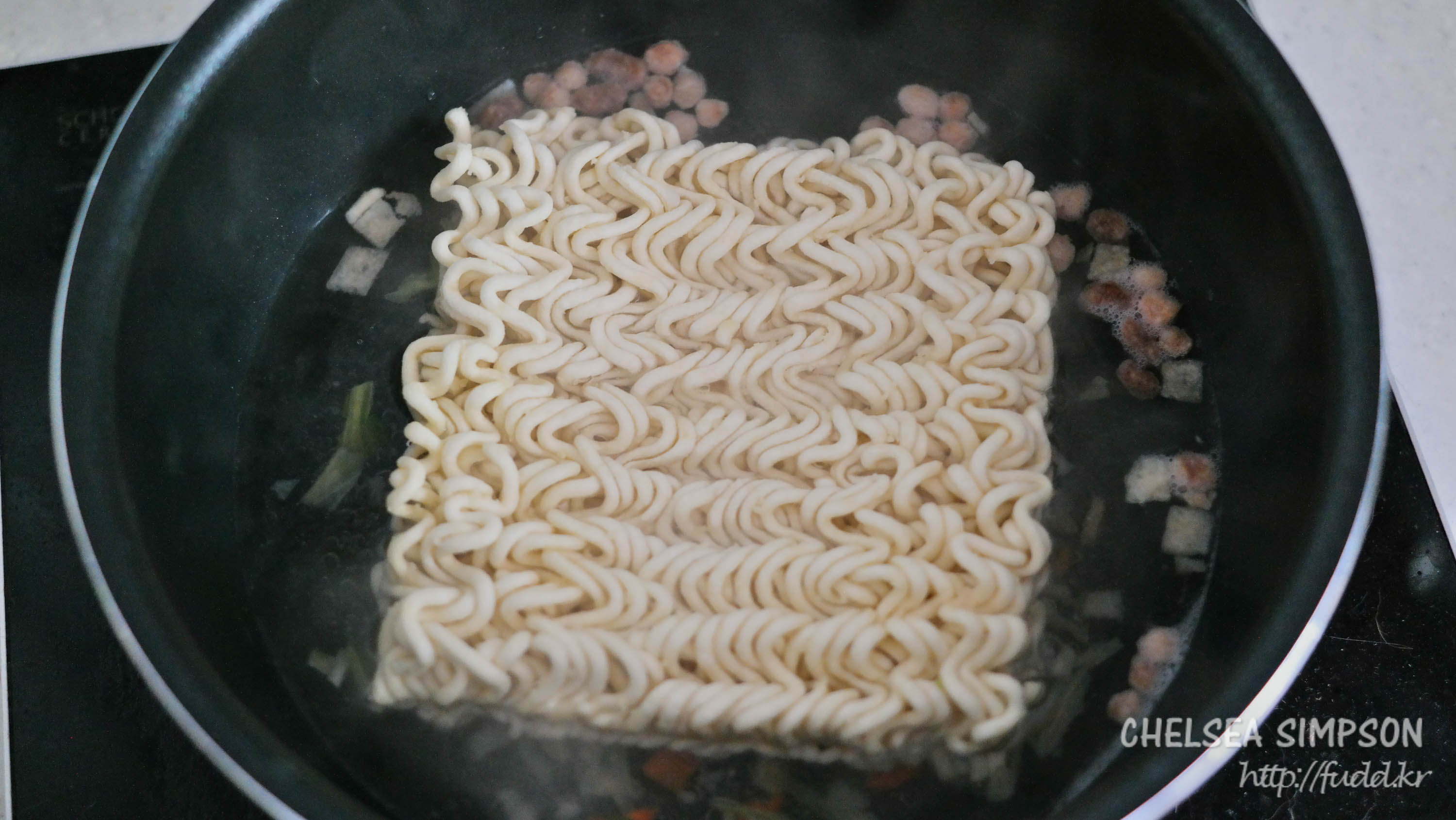 5분 끓인 뒤 불을 끄고 분말스프와 유성스프를 넣었다.