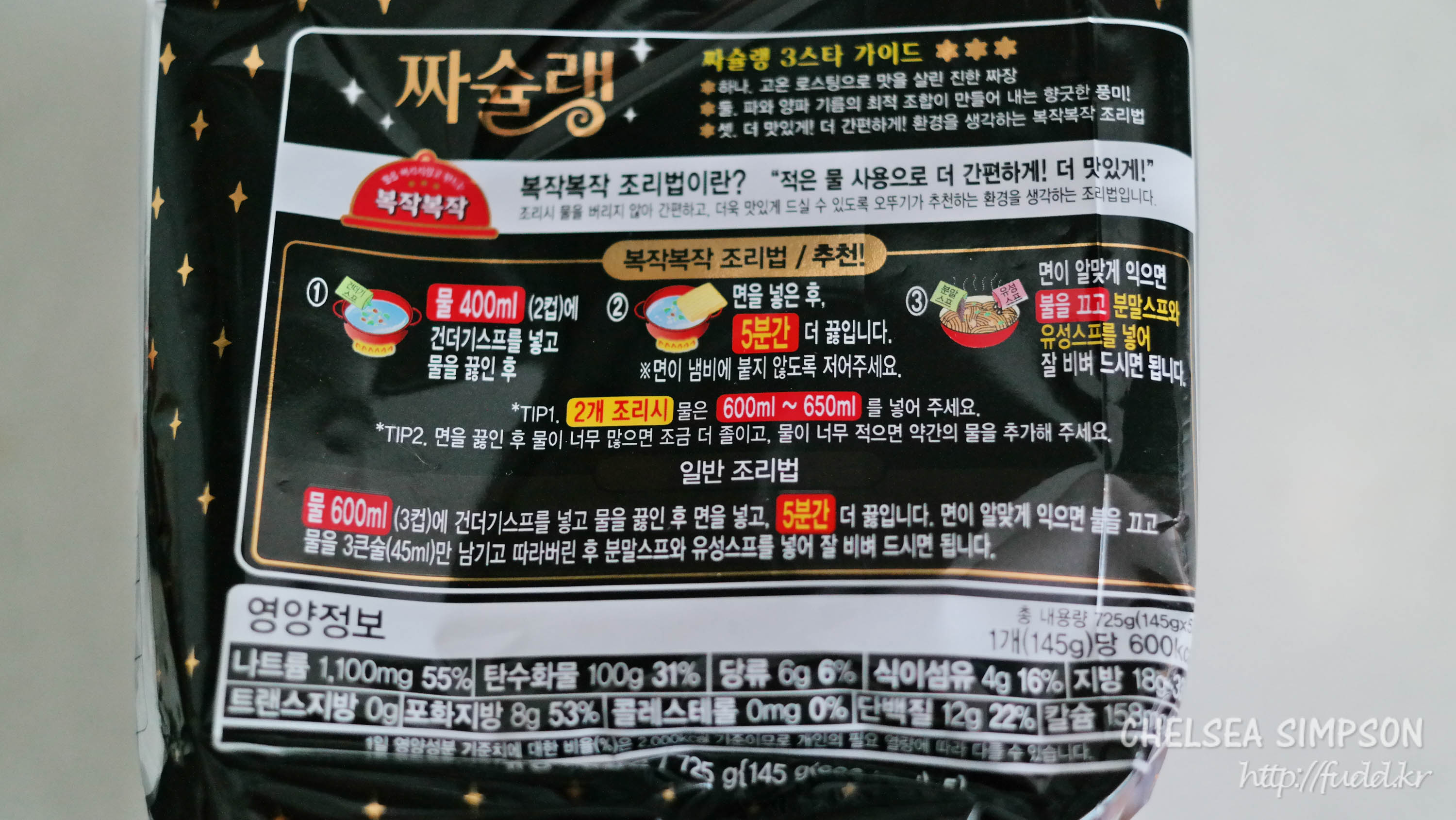 물을 400ml만 넣고 건더기스프와 면을 넣어 5분 끓인 뒤, 불을 끄고 분말스프와 유성스프를 넣어 비벼먹으라고 한다.