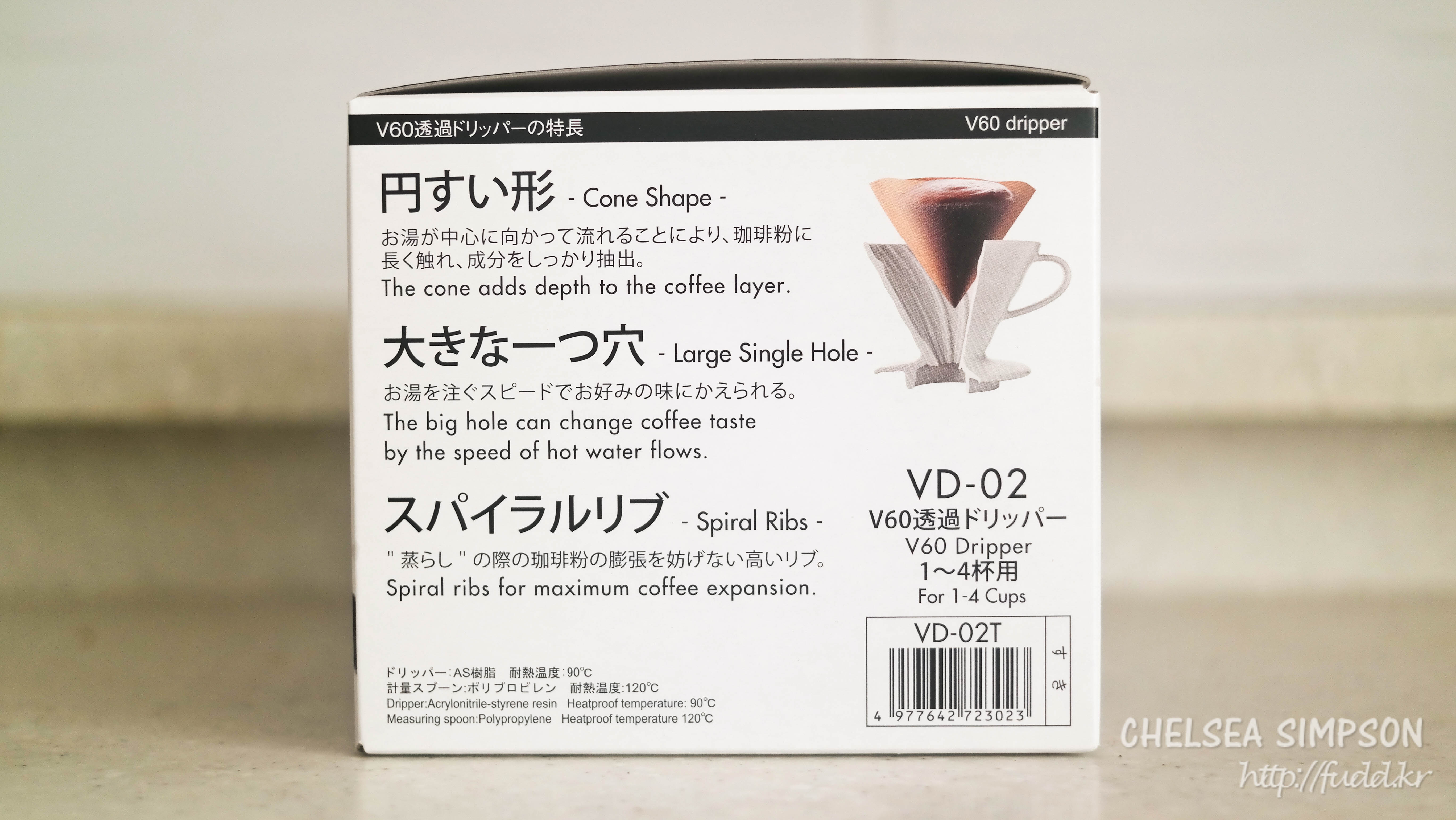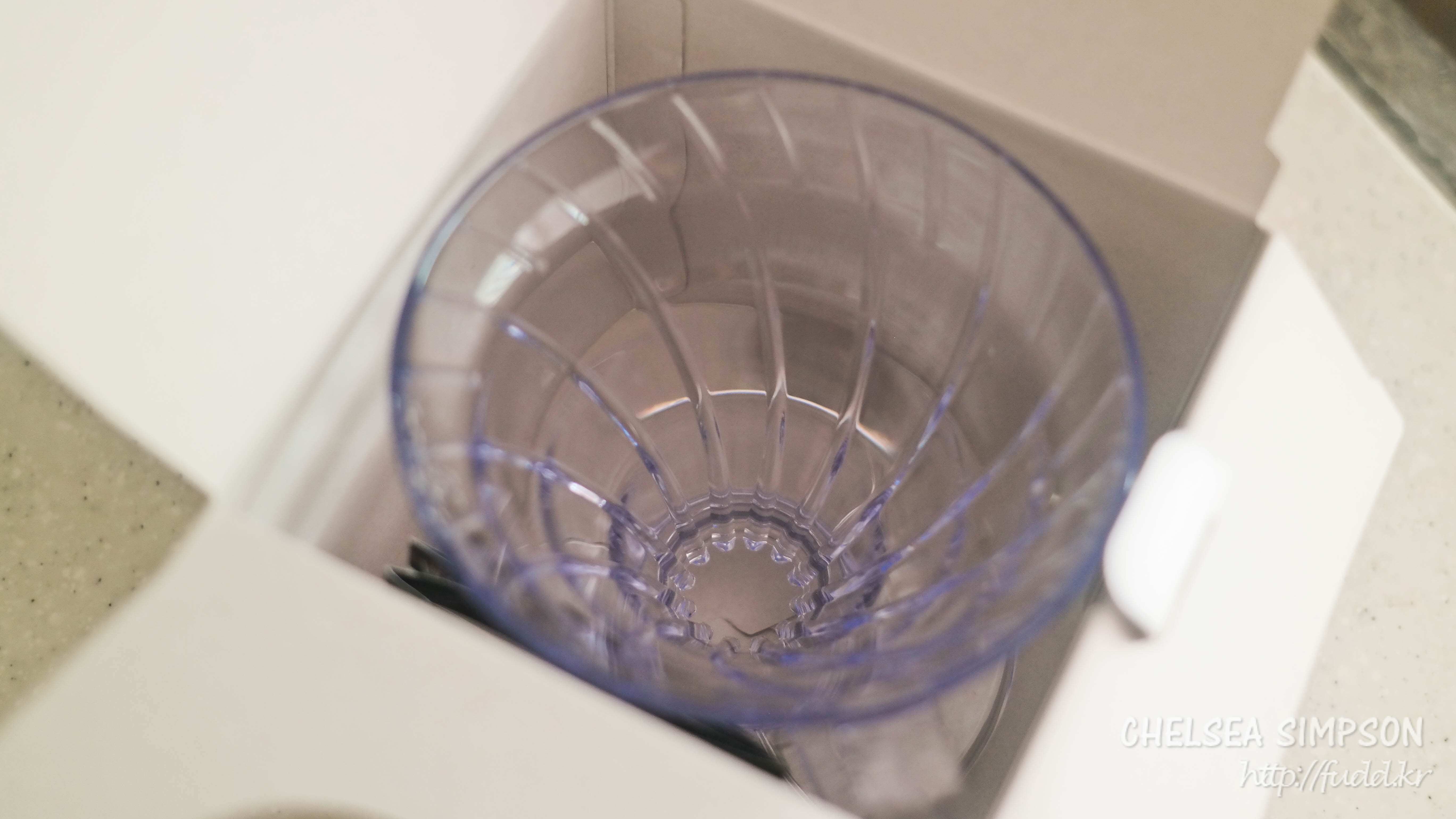원뿔형 모양에 커피 추출구가 큰 편이고, 안쪽에 도드라지는 리브는 나선형이다.