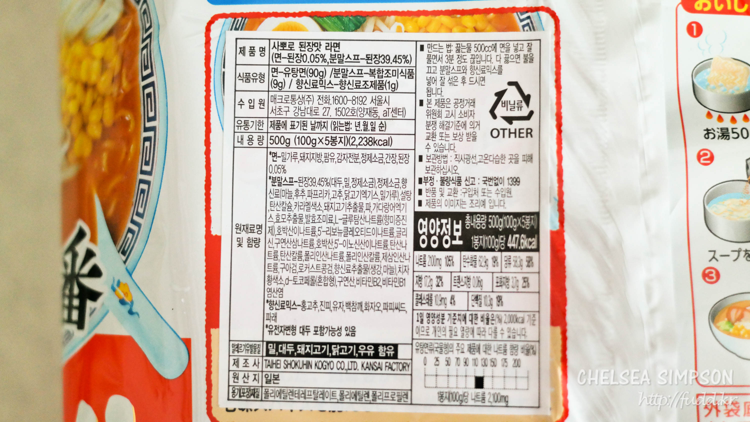 조리법은 물 500ml를 끓이고 면을 넣어 3분 더 조리한 뒤 불을 끄고 분말스프를 섞어서 먹는 것.